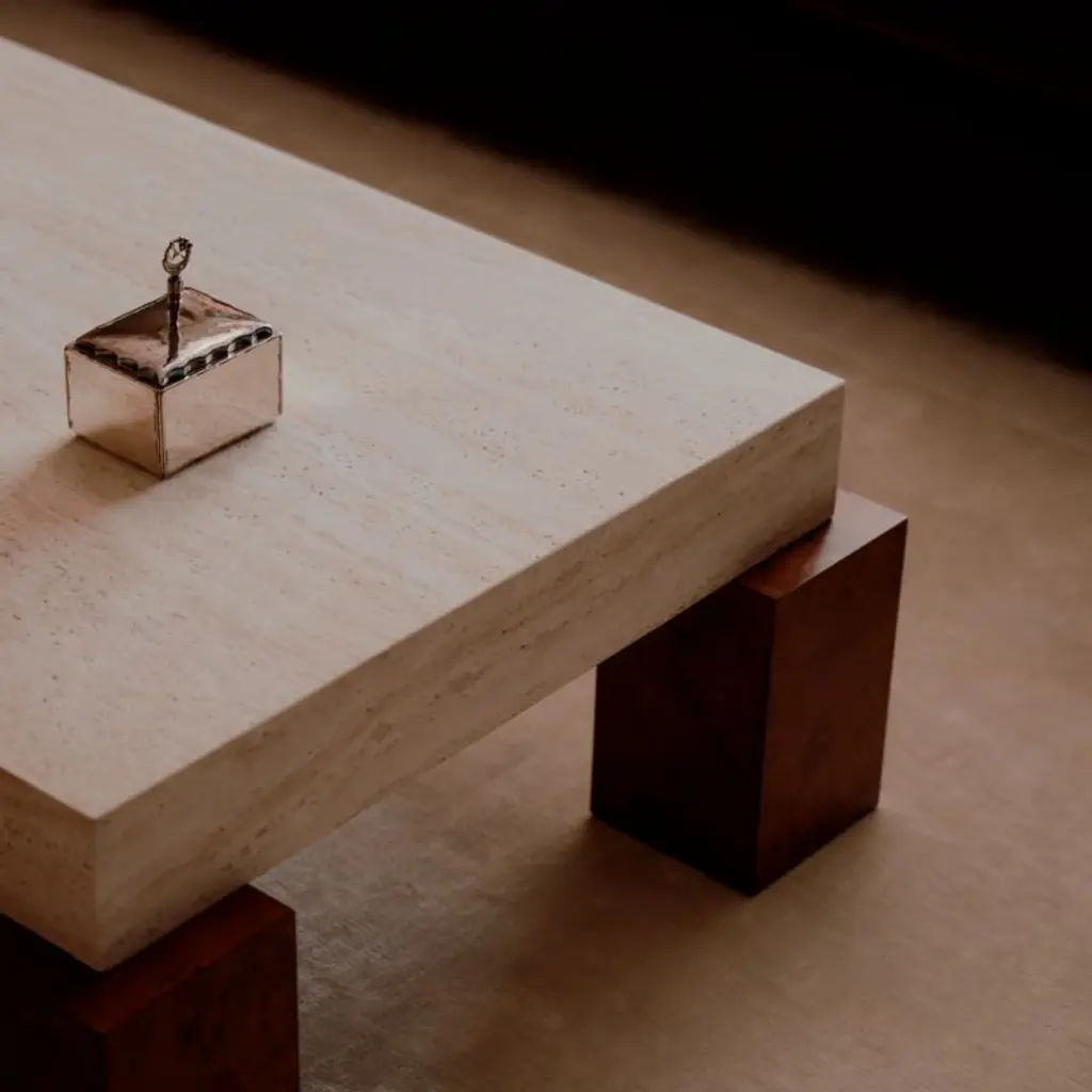 Dualité Travertine And Burl Wood Block Leg 56" Coffee Table By Athena Calderone