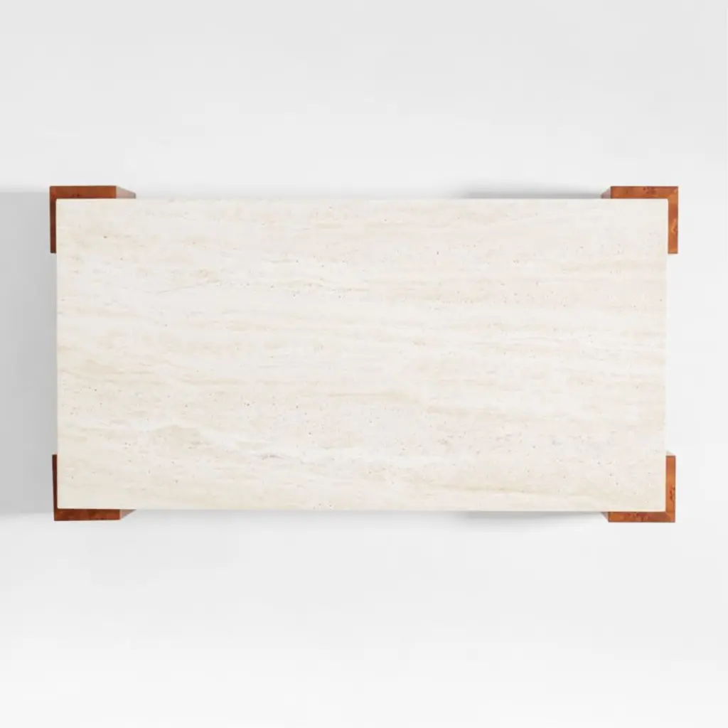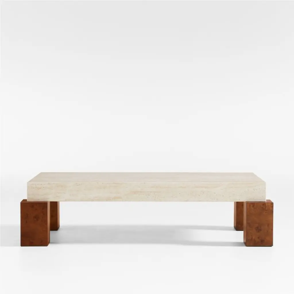 Translating the geometric forms of 1930s design into modern minimalism, Dualite juxtaposes stone and wood in this striking coffee table. Block legs offer broad planes to showcase the fascinating whorls of mappa burl veneer. A thick slab of travertine forms the top, offset on the legs for a dynamic sense of balance. We love the interplay of texture and color between the stone's ivory hue and natural veining and the wood's rich brown stain and vibrant wood grain.Our collaboration with interior designer and bestselling author Athena Calderone brings you a collection of pieces that honor refined and elegant forms. Inspired by the timeless shapes and palettes of the 1930s, Crate x Athena fine-tunes scale, elevated materials and comfort to fit seamlessly into your home.
