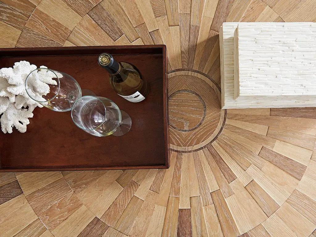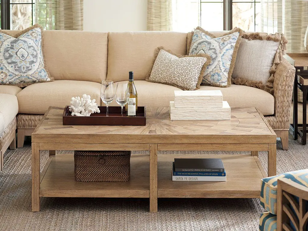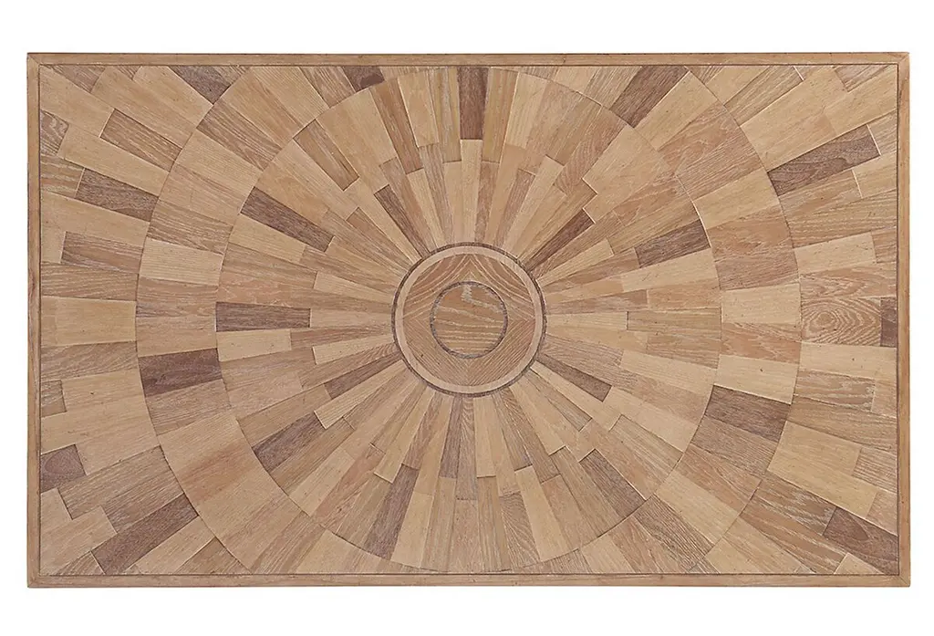 This simply stunning coffee table is sure to be a focal point in any seating area with its meticulously crafted sunburst pattern in white ash, oak, pecan, and walnut veneers. A lower wooden shelf provides plenty of space to display books and favorite accents.