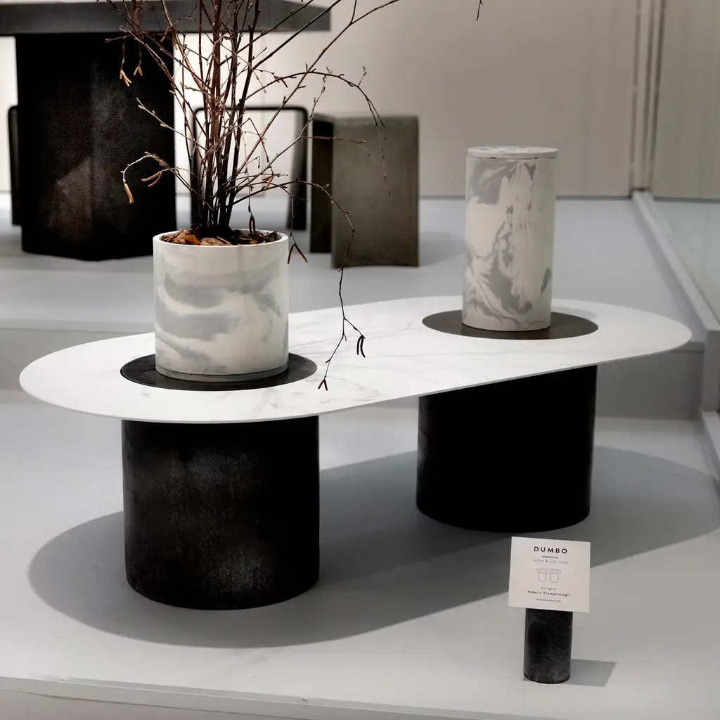 Dumbo Doppio Coffee Table is the perfect synthesis of two materials, concrete, and metal. This peculiar coffee table is available in two versions: metal and concrete. The legs are empty for lightness and made of a single cast of concrete. The table top is a laser-cut sheet of metal made out of brass, inox steel, or iron. The piece is available in different shades. The concrete version is available in white, ardesia, and silver, whereas the metal version is available in white, black, and brass.