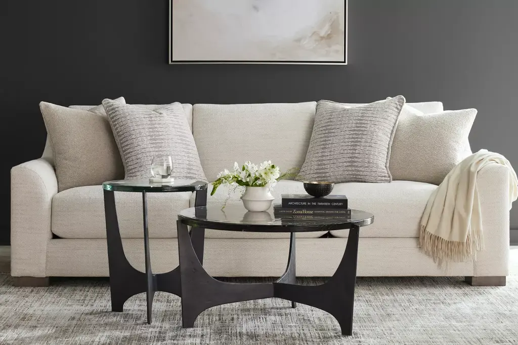 Our Dune bunching coffee and end tables bring a contemporary flair to any space. Together, these two tables form an intriguing silhouette, with varying sizes and heights adding captivating dimension to any room. The recycled aluminum bases boast a textured matte black finish, while the round sand-cast glass tops offer a smooth surface with an organic texture underneath.