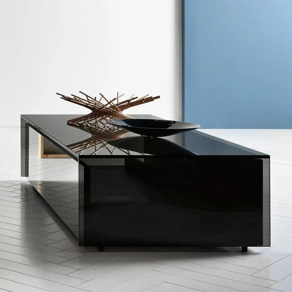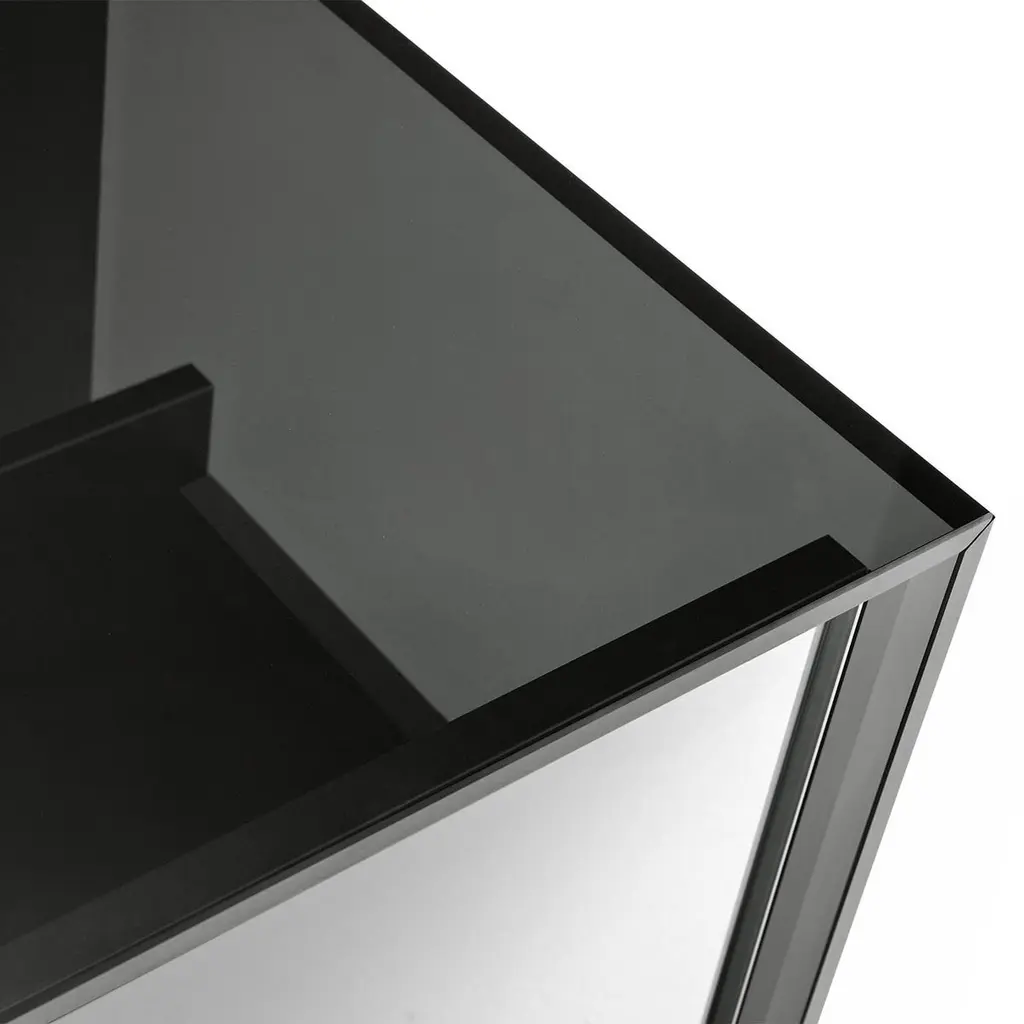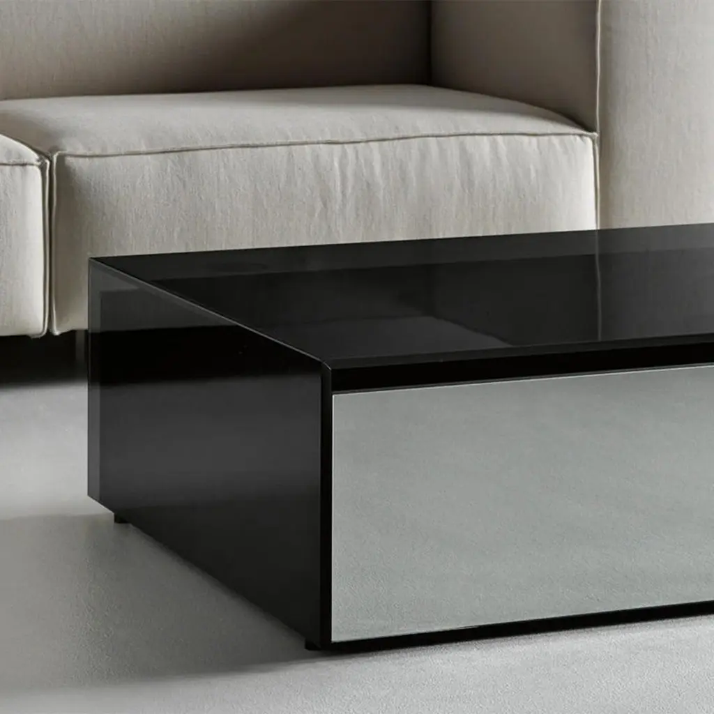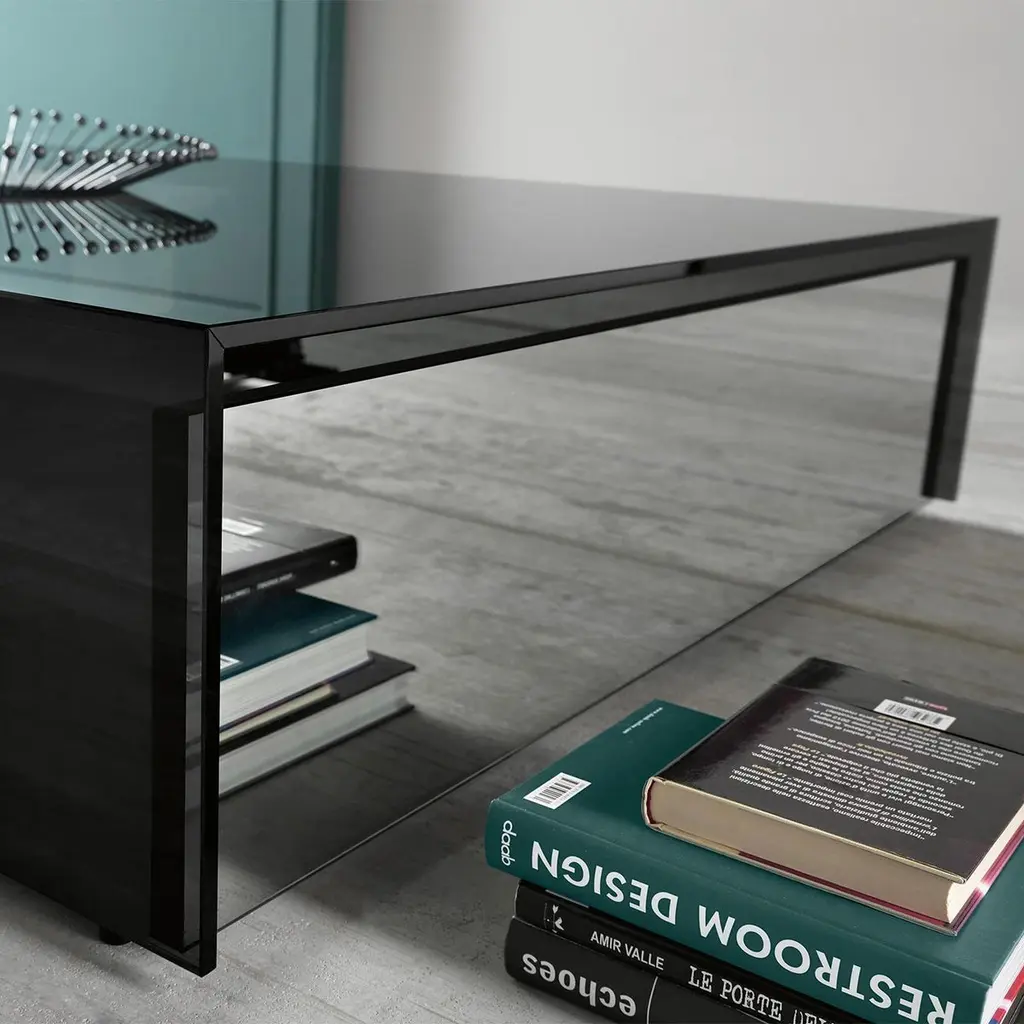 Coffee table Dusk with all structure in smocked glass, with 2 drawers each sides with easy glide system. Drawer structure in black wood with smocked mirror glass front.