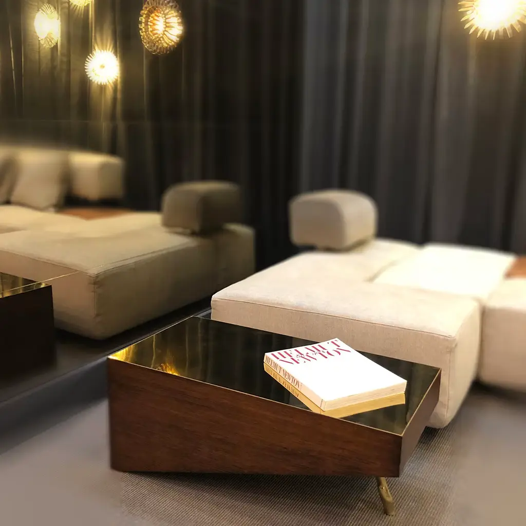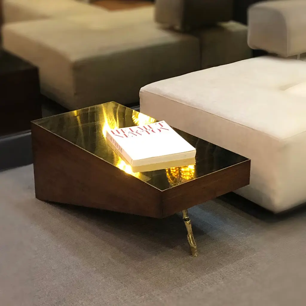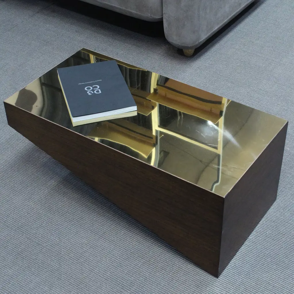 This coffee table is inspired by a mountain near a Buddhist temple where tiny sticks were placed underneath massive boulders, appearing to support them while being too small to bear the stone’s weight. This concept is transformed into this table defined by a tilted, mirrored structure, reminding us that everything is temporary.