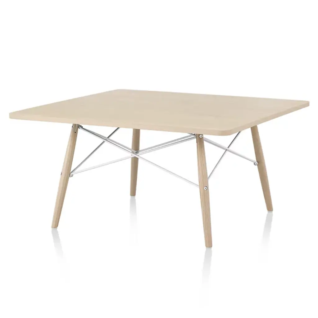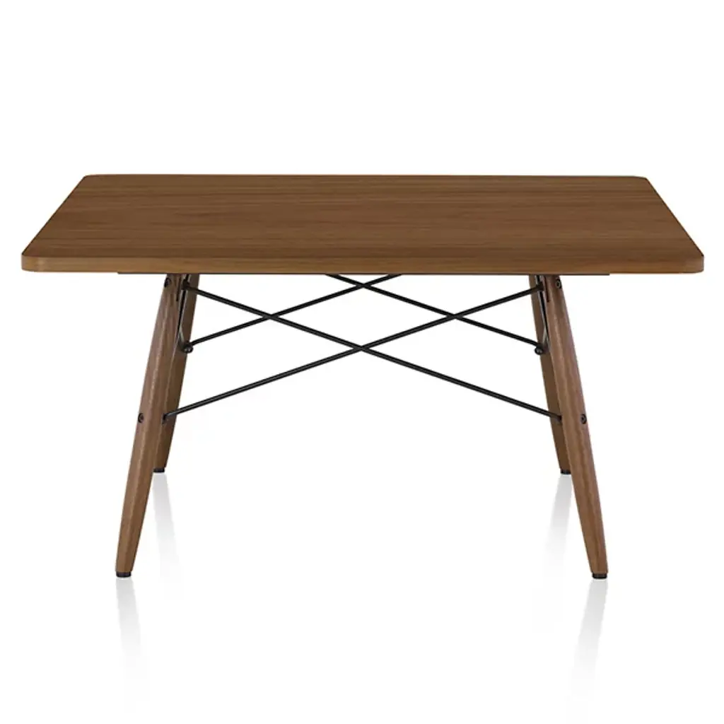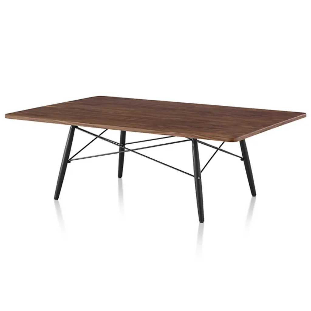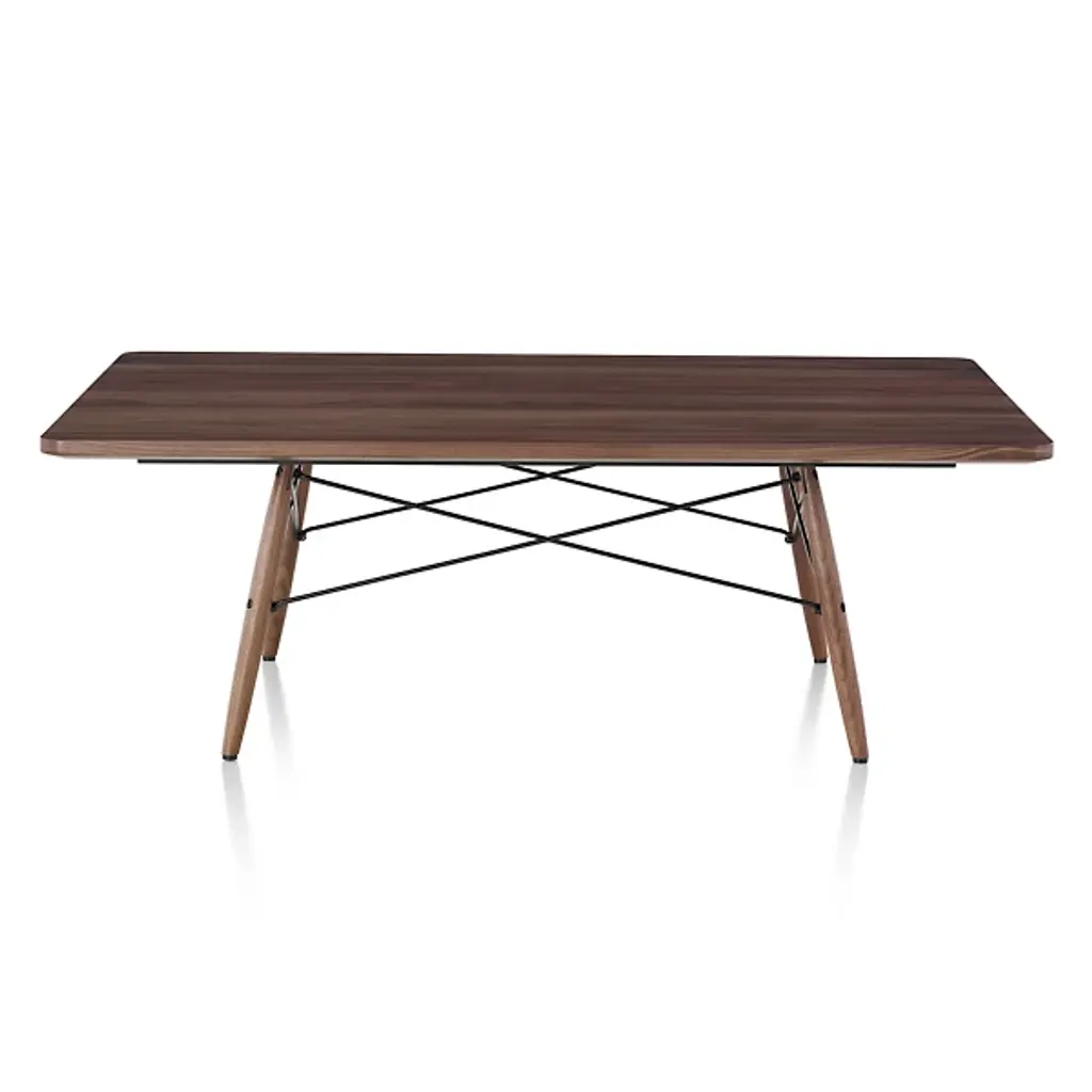 A remake of an iconic design. The sleek and modern Eames® Coffee Table by Herman Miller was invented by legendary designers Charles and Ray Eames for their home in Pacific Palisades. Its wooden base features metal cross-struts to create an eye-catching, ultra-contemporary aesthetic. Choose between its original rectangular top or its modified square top, available in a variety of natural materials and finishes.