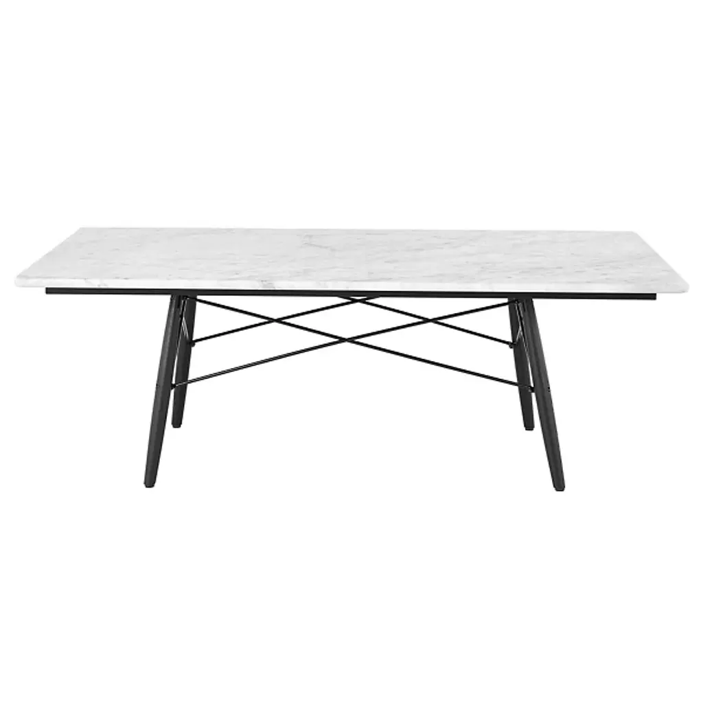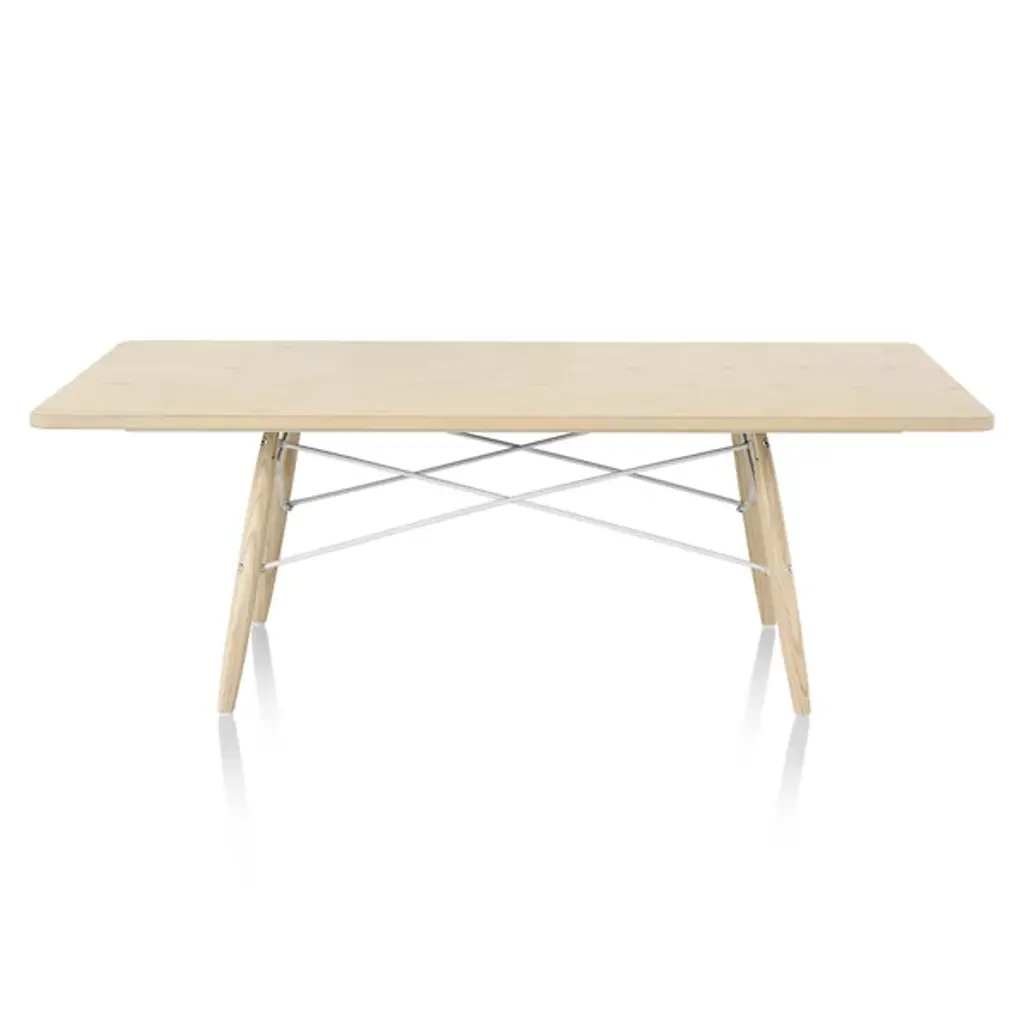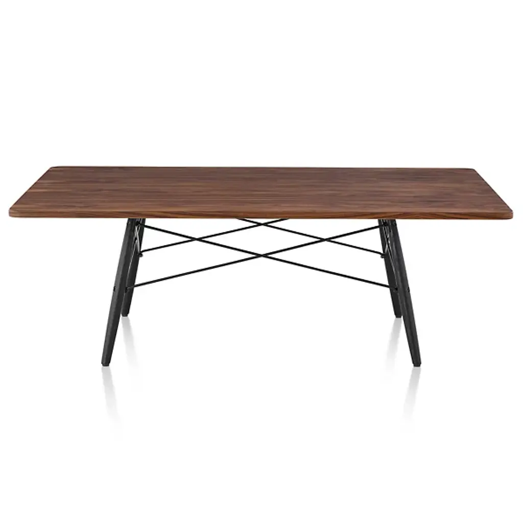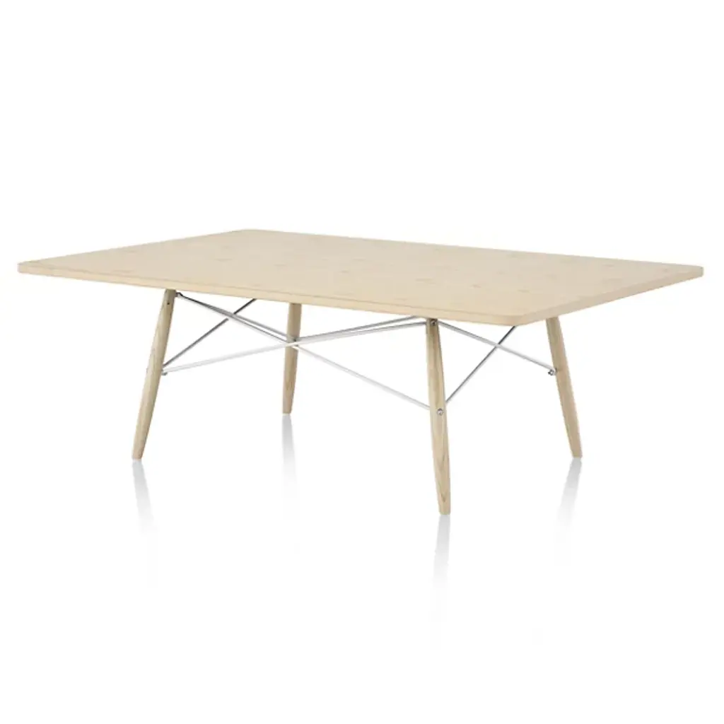A remake of an iconic design. The sleek and modern Eames® Coffee Table by Herman Miller was invented by legendary designers Charles and Ray Eames for their home in Pacific Palisades. Its wooden base features metal cross-struts to create an eye-catching, ultra-contemporary aesthetic. Choose between its original rectangular top or its modified square top, available in a variety of natural materials and finishes.