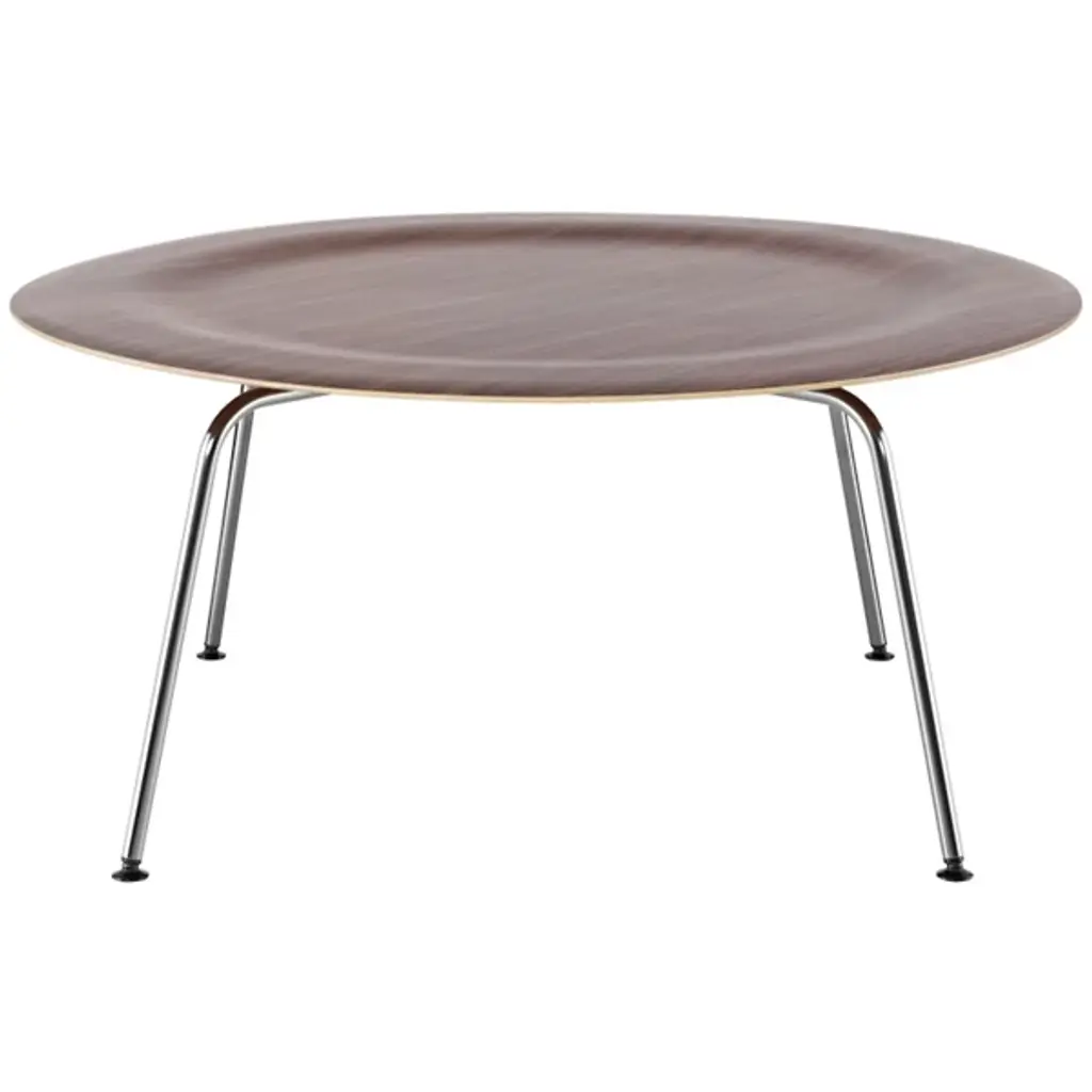 A lovely example of early Charles and Ray Eames design. The Eames® Molded Plywood Coffee Table - Metal Base by Herman Miller® features a round plywood top molded with a slight indent. While designed to fit in seamless with the rest of the Eames Molded Plywood collection, this table is versatile enough to complement any modern (or mid-century modern) living space.