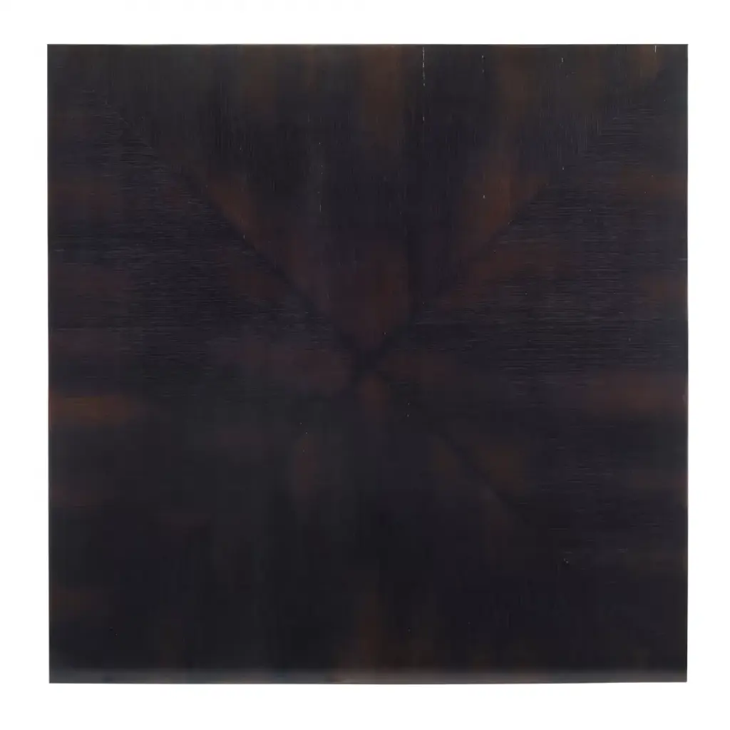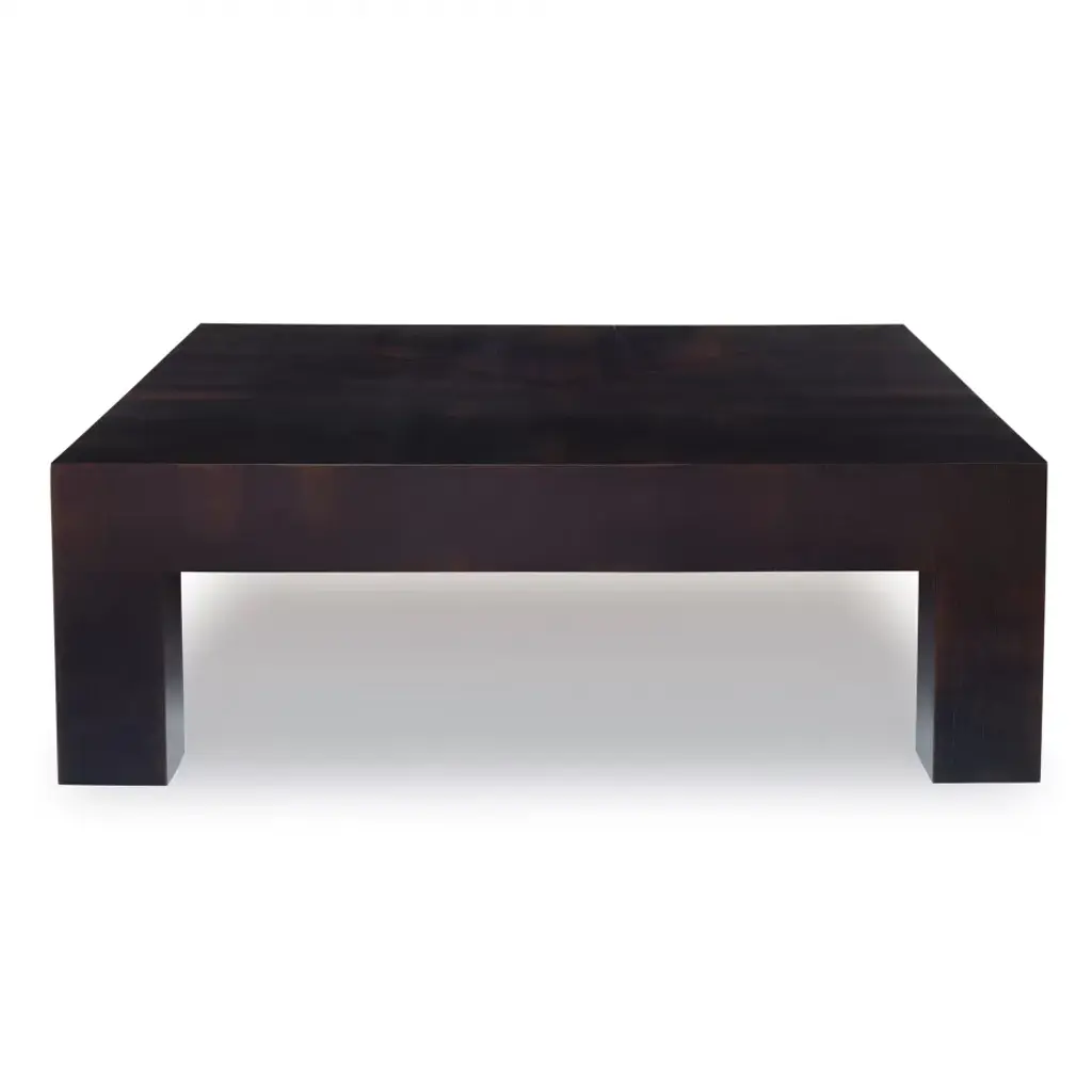 This minimalist cocktail table is constructed of White Oak with White Oak veneer. The table features a veneered, mitered top and is finished in a dark, black brown stain. One drawer.