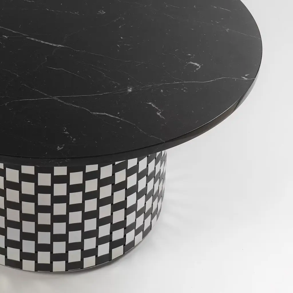 Named after Hecate, the Greek goddess of magic and the night, this coffee table is marked by a striking combination of elegant and dark hues, contrasting textures, and refined materials. Inspired by the Optical Art movement of the 1960s, it rests on a cylindrical base fashioned of Splot, interweaving black and natural-finished aluminum which contrasts the opaque black hue of the round top in Nero di Belgio Marble. Hidden wheels allow to easily move the coffee table.