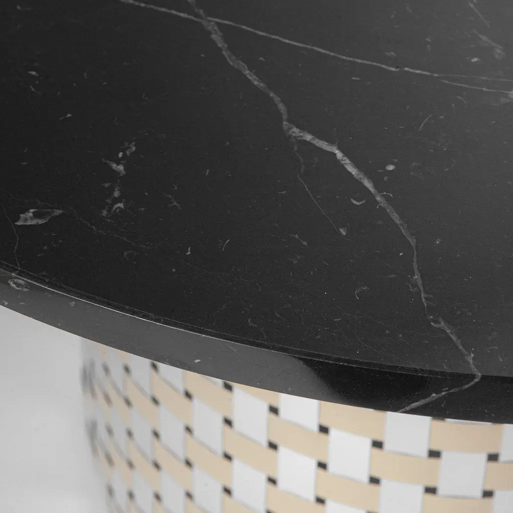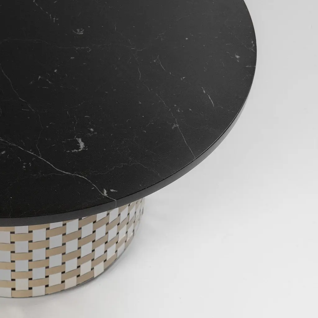 A splendid exercise in contrasts and balances, this coffee table flaunts a clean and essential design meticulously crafted of refined materials. Infusing a sophisticated flair in any modern decor, it is inspired by the captivating motifs typical of the Optical Art movement of the 1960s. Showcasing a large round top in black Nero di Belgio marble, it rests on a cylindrical base fashioned of Splot, a handmade interwoven array of natural and gold-finished aluminum slats recycled from industrial waste.