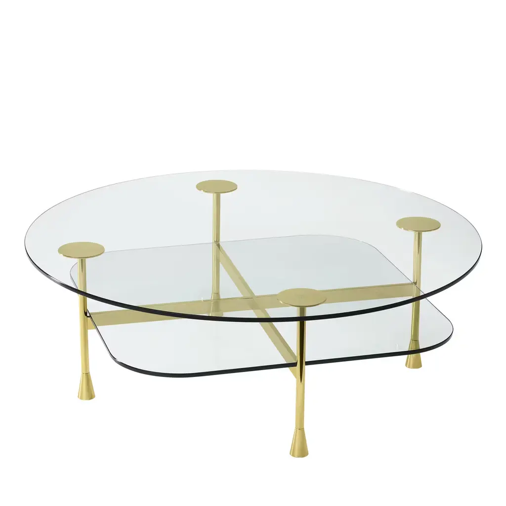 Echo tables allow the customer to create unique combinations with one of two shelves in different marble varieties depending on their individual taste and creativity. This dynamic and sophisticated Echo Coffee Table is crafted in satin brass with the lower shelf in matt polished ash gray marble and the table top in extraclear glass.