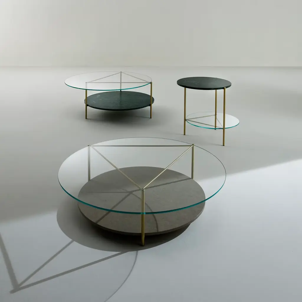 Echo tables allow the customer to create unique combinations with one of two shelves in different marble varieties depending on their individual taste and creativity. This dynamic and sophisticated Echo Coffee Table is crafted in satin brass with the lower shelf in matt polished ash gray marble and the table top in extraclear glass.