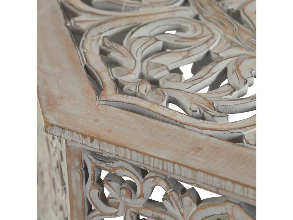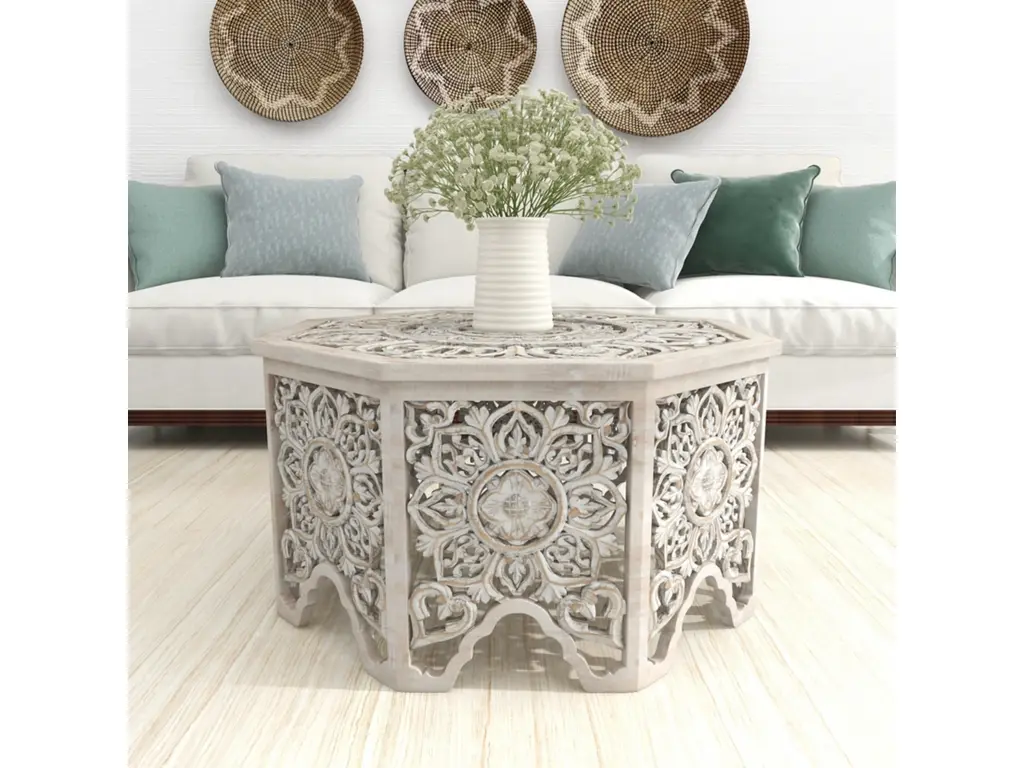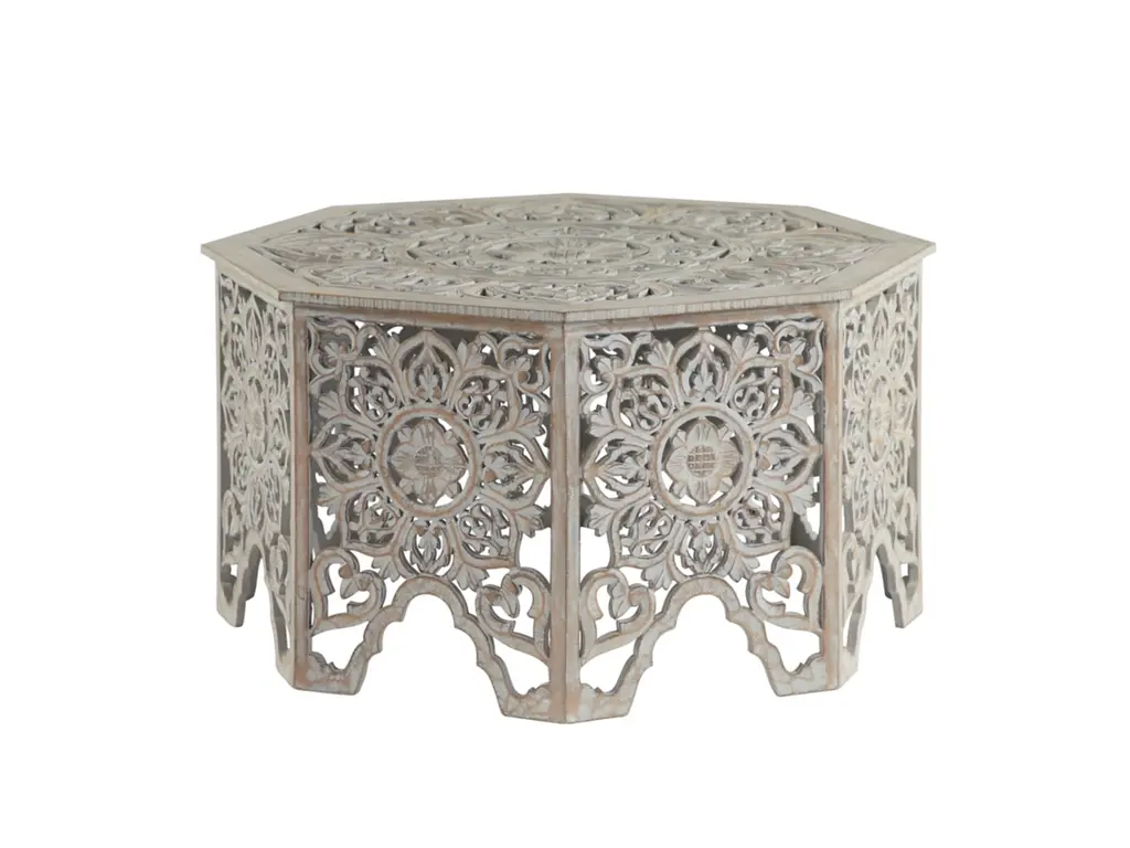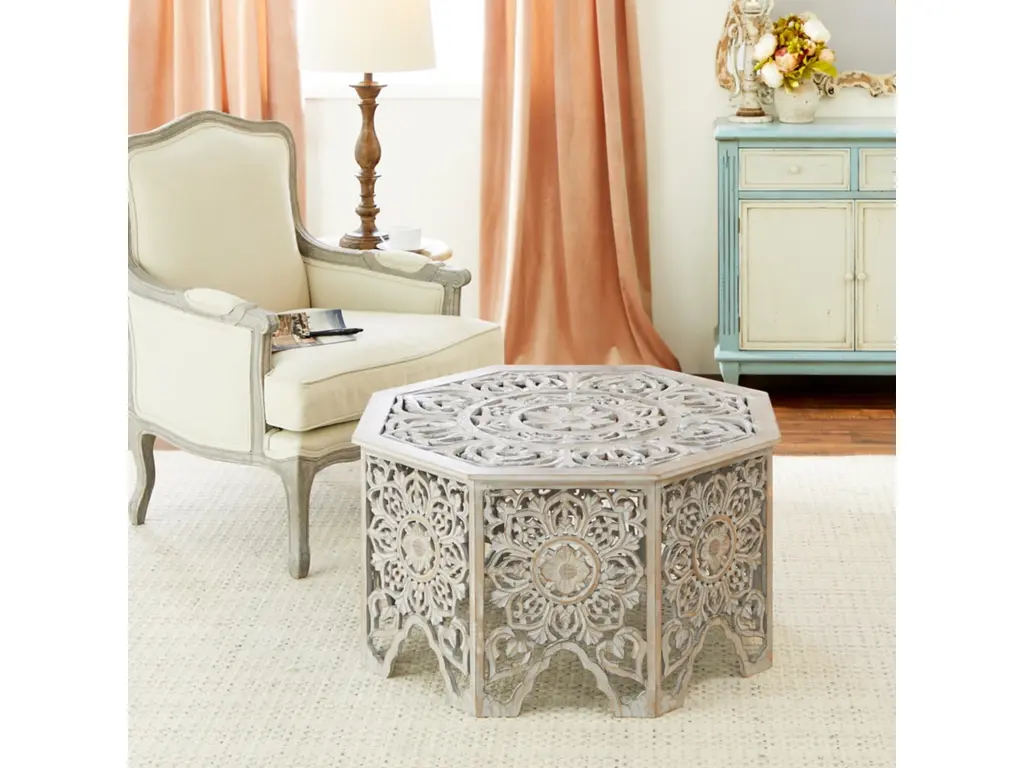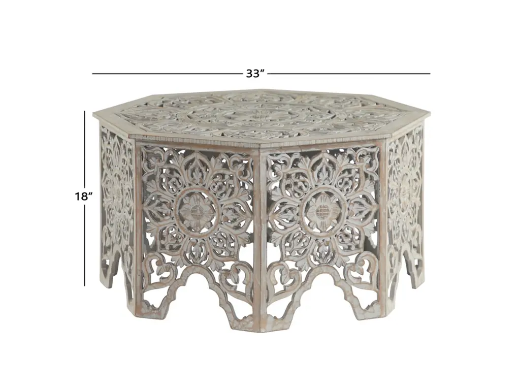 A spacious table top with a unique design offers an eye catching display from every angle. Useful and elegant, coffee tables are more than just a pretty piece of furniture in front of your couch. Eclectic style light gray wood coffee table will complement other ornate carved furniture pieces for the perfect global feel. This item ships in 1 carton. Gray wood coffee table with carved floral and leaf patterns. Due to the handmade nature of this item, no two will be alike, there will be slight differences in shape, size, and color. Suitable for indoor use only. Maximum weight limit is 100 lbs. Made in India. Eclectic style.