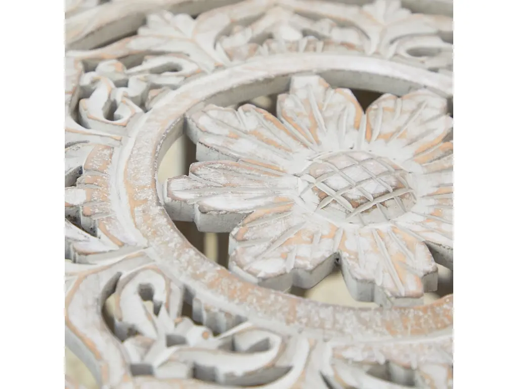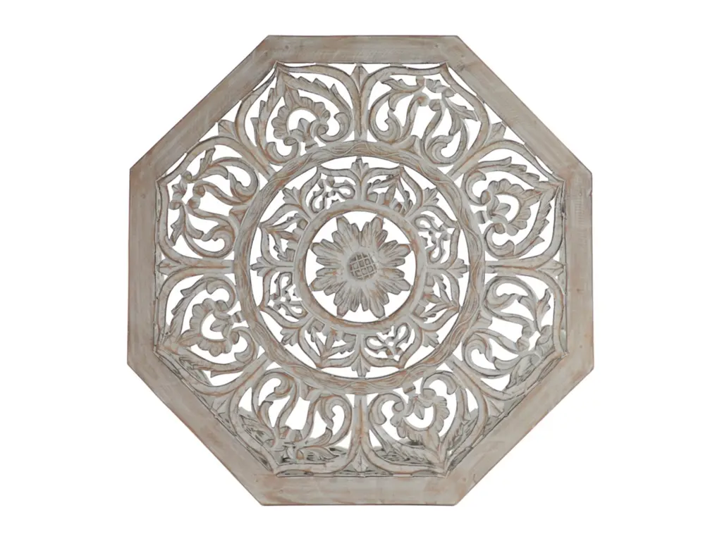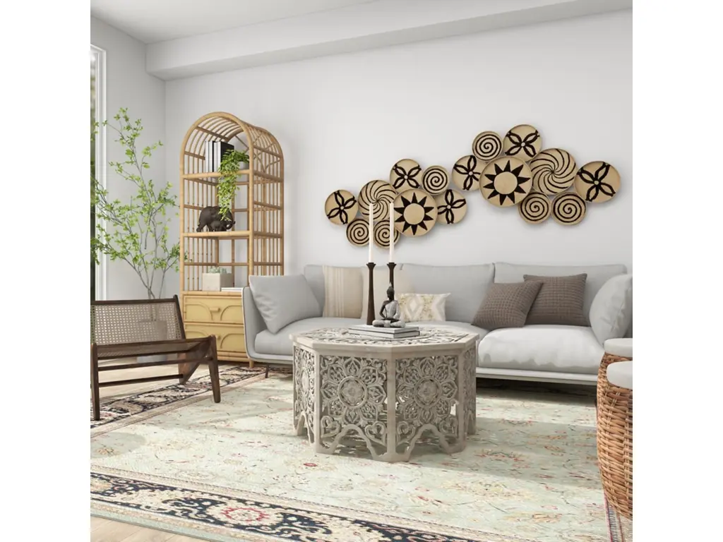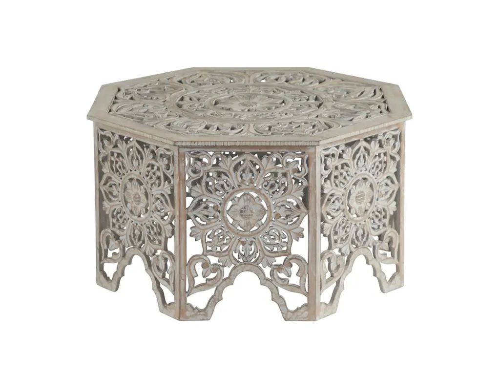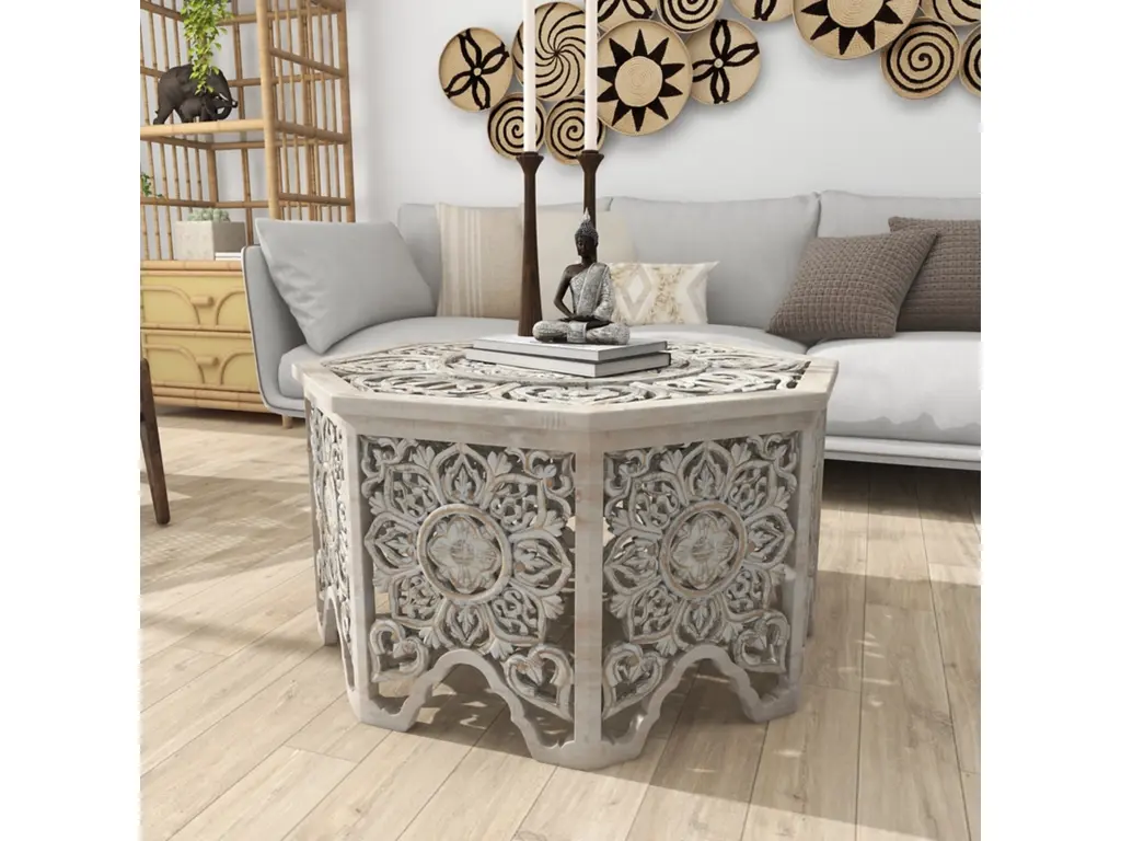 A spacious table top with a unique design offers an eye catching display from every angle. Useful and elegant, coffee tables are more than just a pretty piece of furniture in front of your couch. Eclectic style light gray wood coffee table will complement other ornate carved furniture pieces for the perfect global feel. This item ships in 1 carton. Gray wood coffee table with carved floral and leaf patterns. Due to the handmade nature of this item, no two will be alike, there will be slight differences in shape, size, and color. Suitable for indoor use only. Maximum weight limit is 100 lbs. Made in India. Eclectic style.