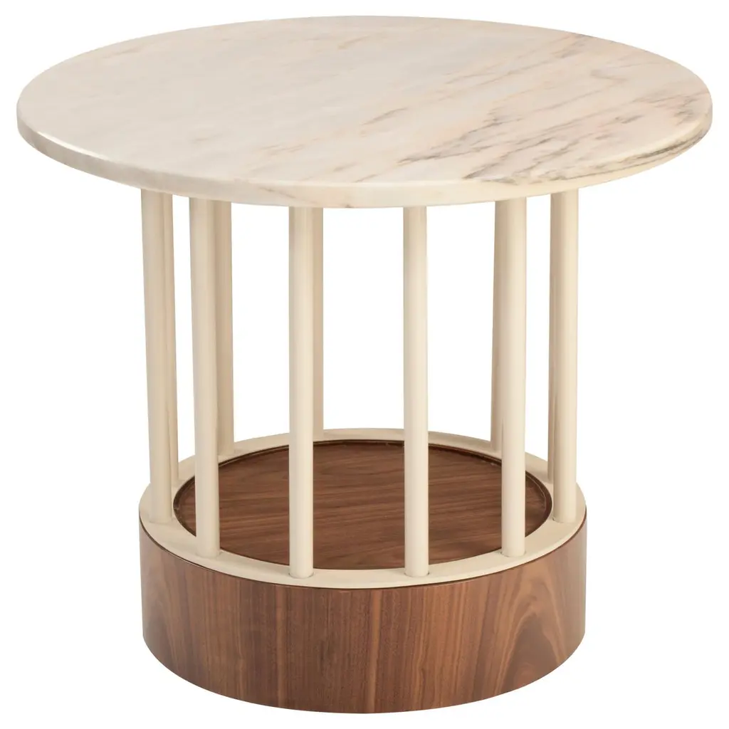The Eclipse Coffee Table a sculptural piece featuring a stone top, supported by an undulating, notched wood base. It creates an interplay of positive and negative space, offering visual intrigue from different angles. The table is available in finishes like Marquina Black Marble and Volakos White Marble for the top, paired with finish options in either oak or walnut. The overlapping profile creates an intriguing visual architecture.