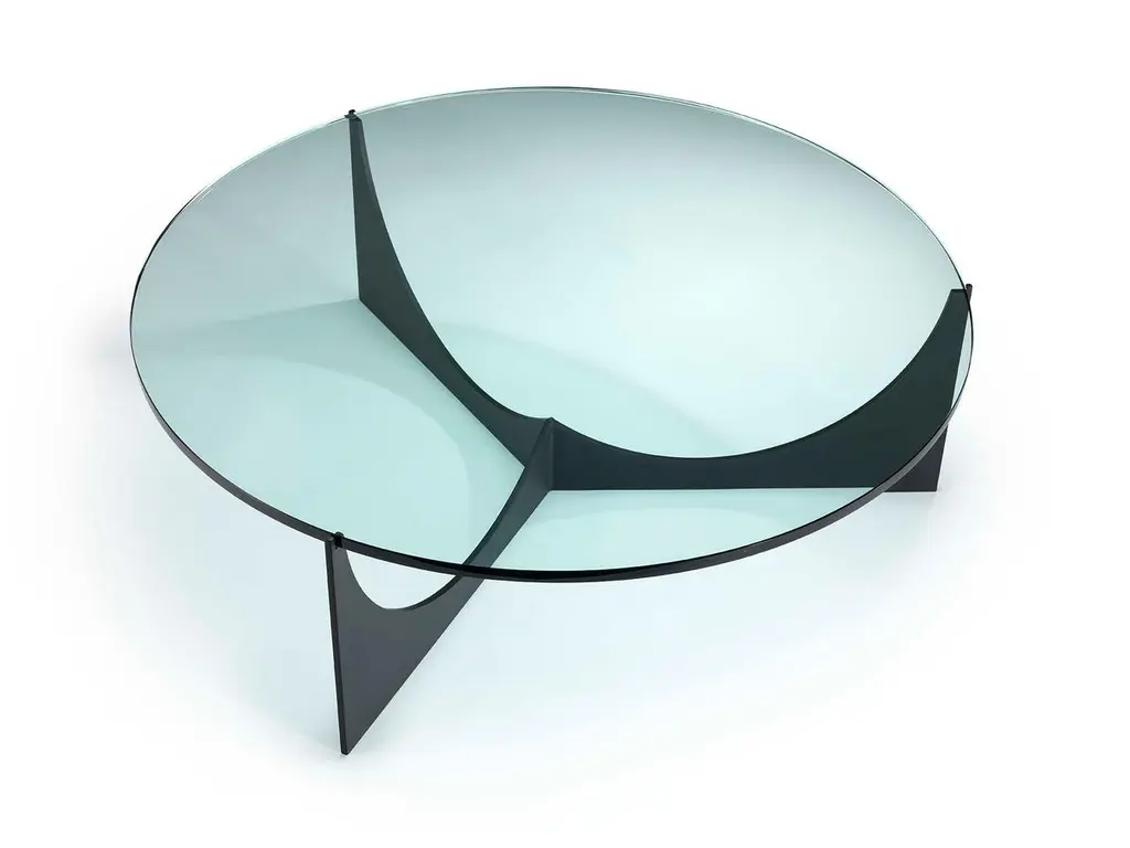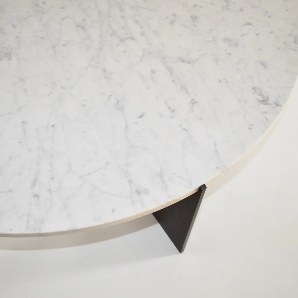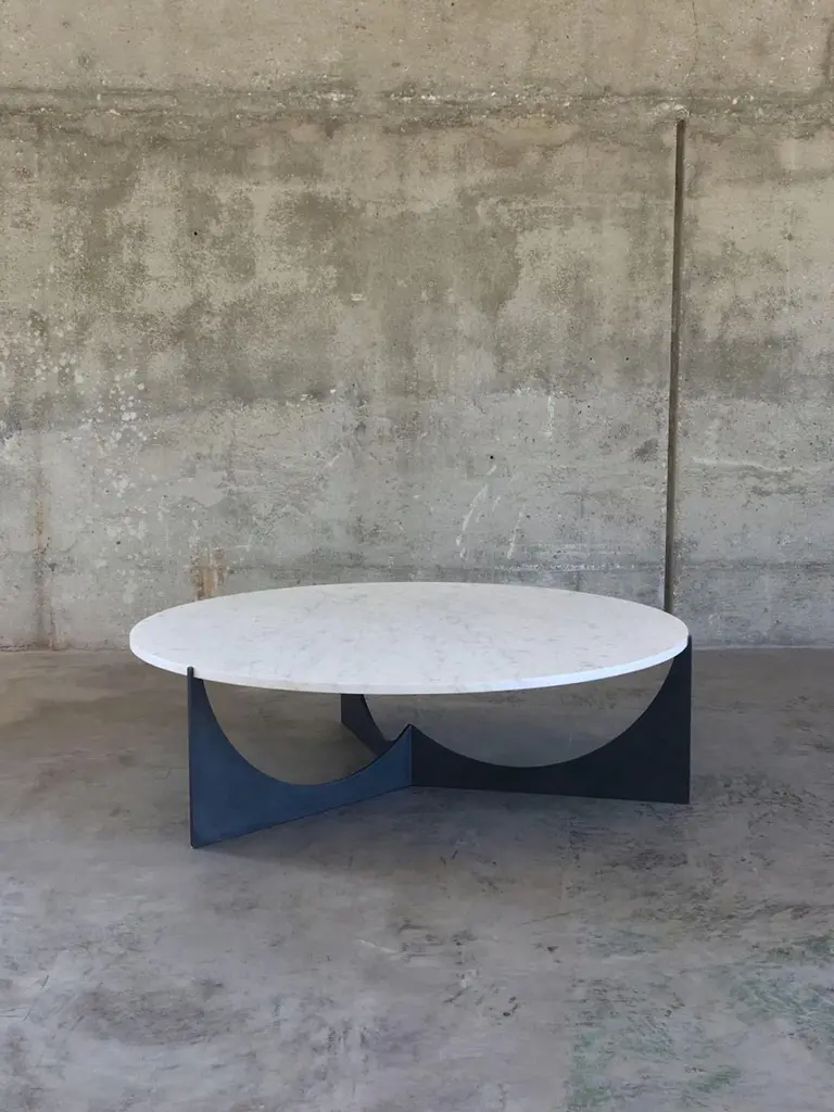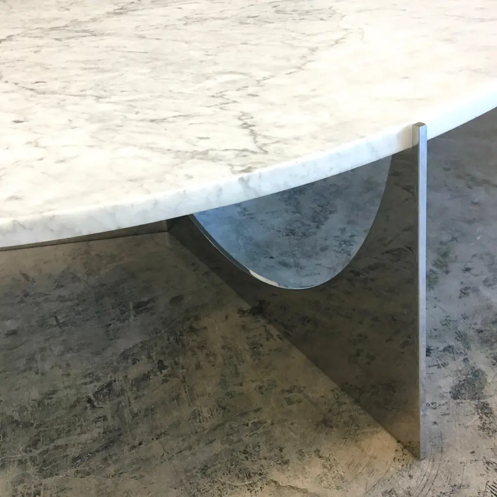 Ten10 Eclipse coffee table with a base in stainless steel, polished or powder coated matte black, and a top in honed granite measuring 43 3/8" diameter x 3/4" thick. Top also available in honed Carrara marble or glass. Please inquire for stone availability. Suitable for indoor or outdoor use.