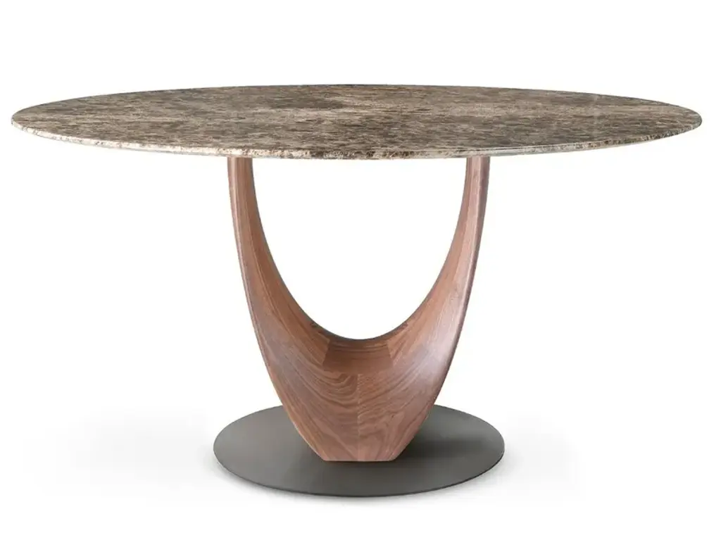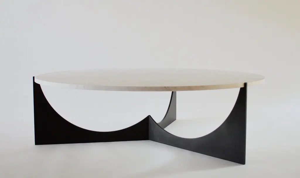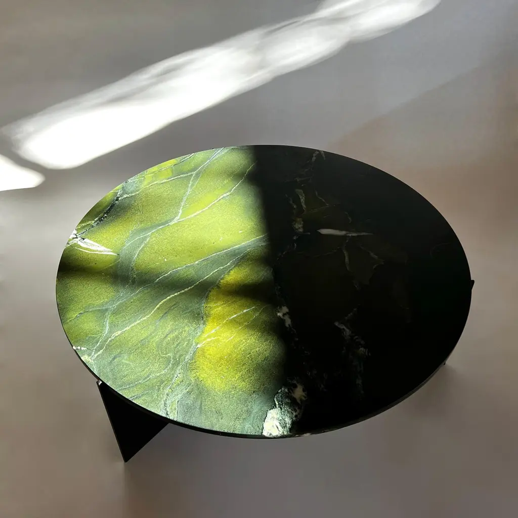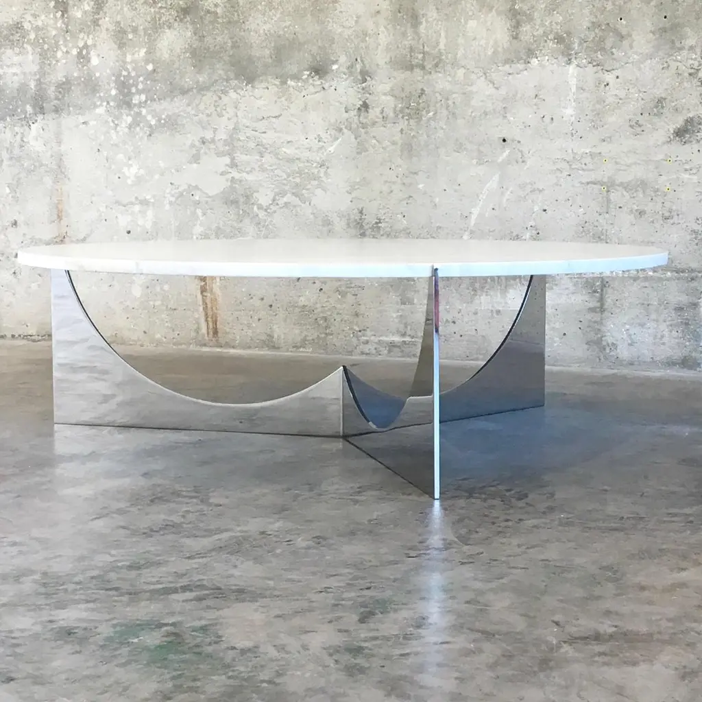 Ten10 Eclipse coffee table with a base in stainless steel, polished or powder coated matte black, and a top in honed granite measuring 43 3/8" diameter x 3/4" thick. Top also available in honed Carrara marble or glass. Please inquire for stone availability. Suitable for indoor or outdoor use.