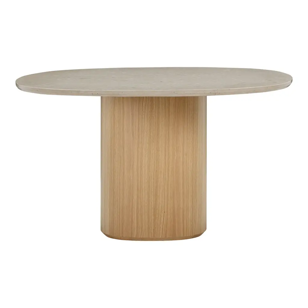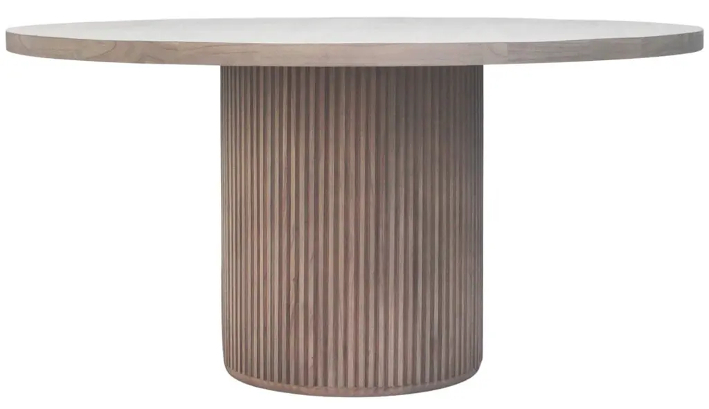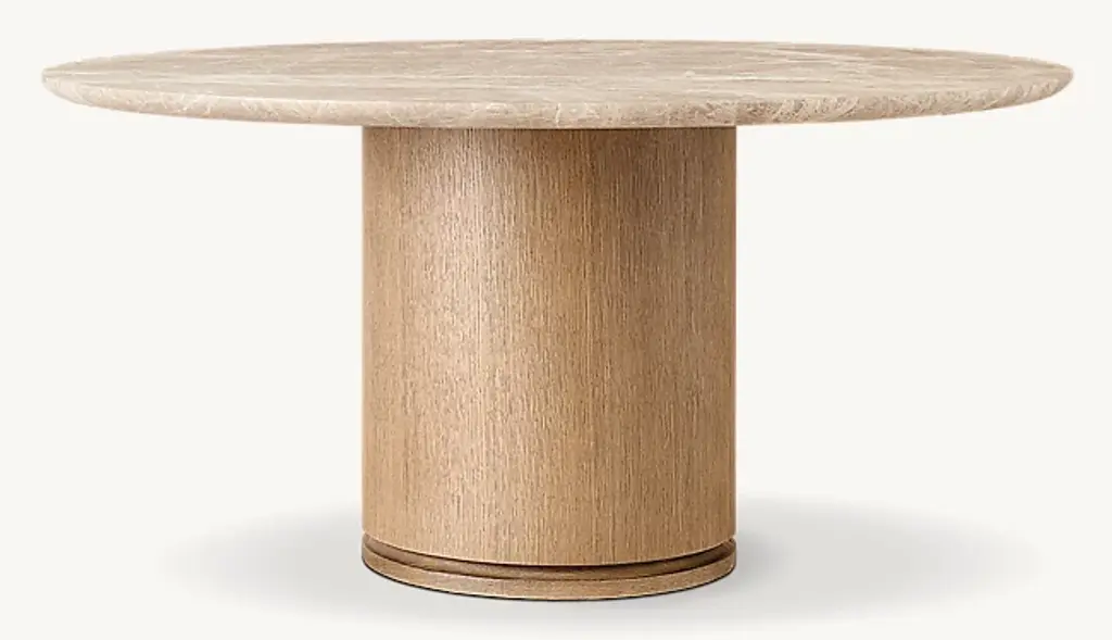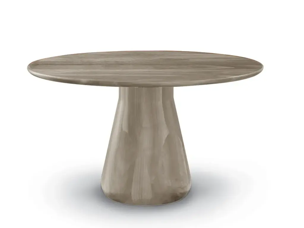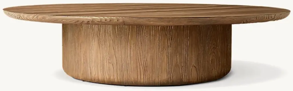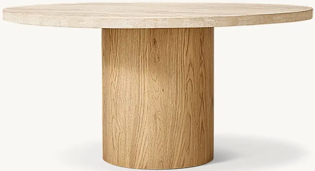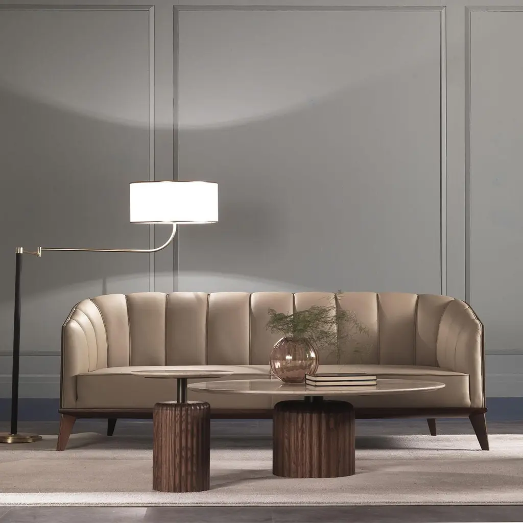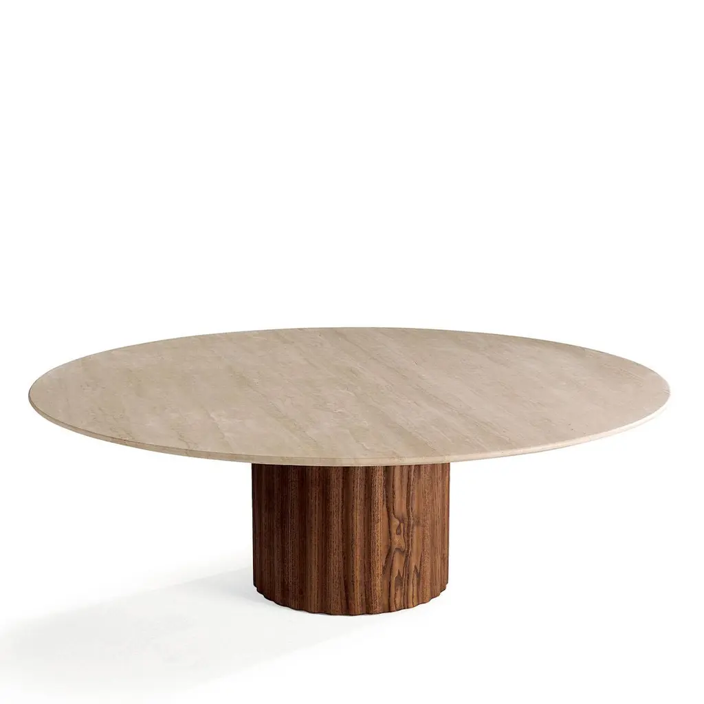 A sophisticated addition to elegant modern interiors, this coffee table boasts harmoniously distributed volumes enhanced by natural materials. A wide round top in Travertine marble gets sustained by a sturdy bronzed metal frame in turn fitted to a sculptural walnut-stained ash base, its fluted textures lending the design its distinctive dynamism.