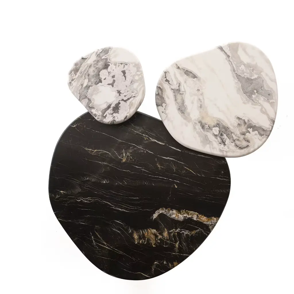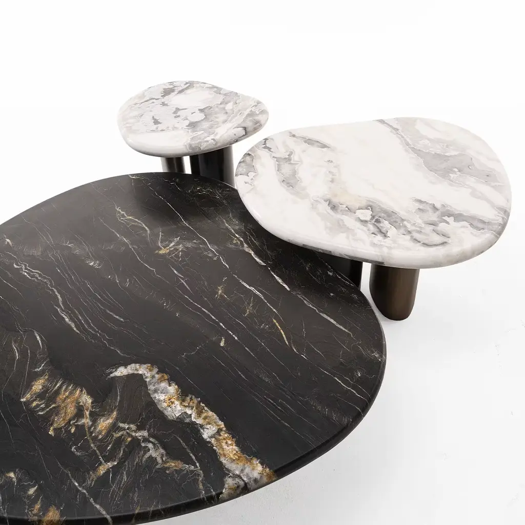 The ethereal charm of clouds and the concrete beauty of marble converge in this exclusive coffee table. Raised on a sculptural base consisting of a brushed-black round-cut leg and of an oval-cut golden leg, a prized Belvedere marble top enchants with its fluid contours inspired by clouds. Please explore different versions from the Cloud series in the Artemest catalog.