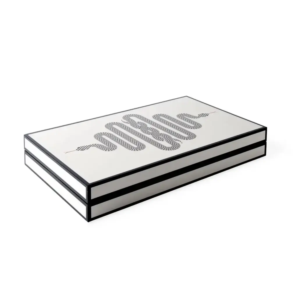 Charm your companions on game night with our Eden Backgammon Set. Crafted in couture lacquer, the high-gloss box features an intricately intertwined duo of slithering serpents. It opens to reveal a striking interior in classic black, ivory, and red, featuring our snakes head-to-head. After vanquishing your foes, fold it closed for a fierce cocktail table accent.
