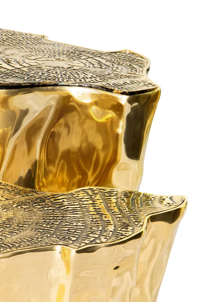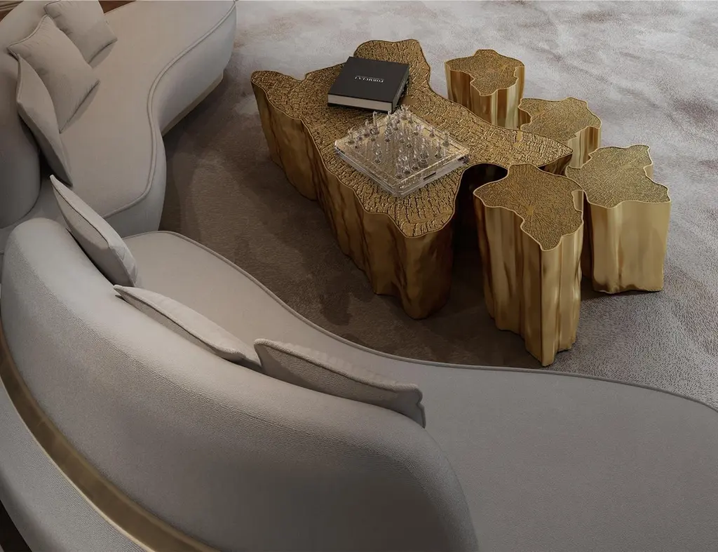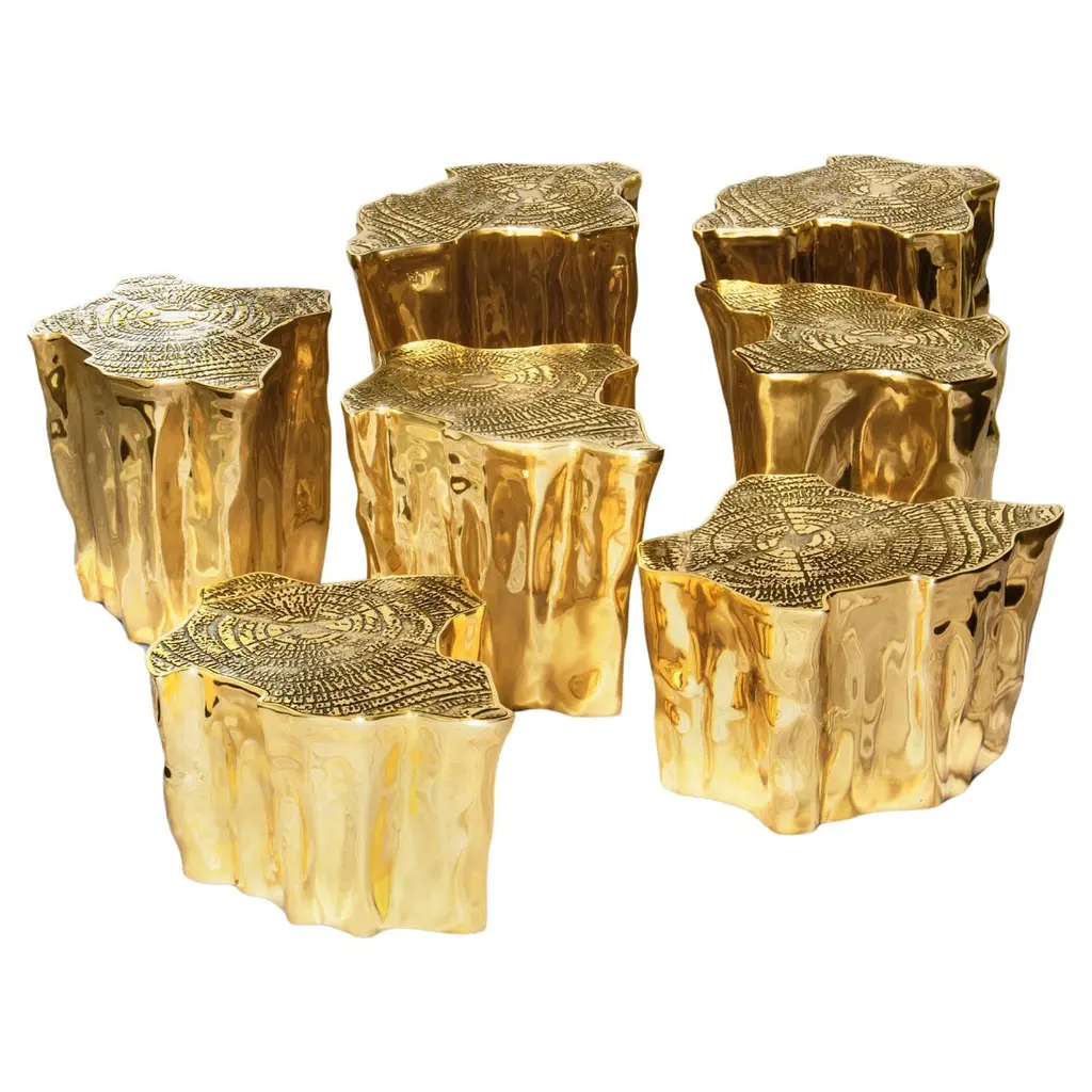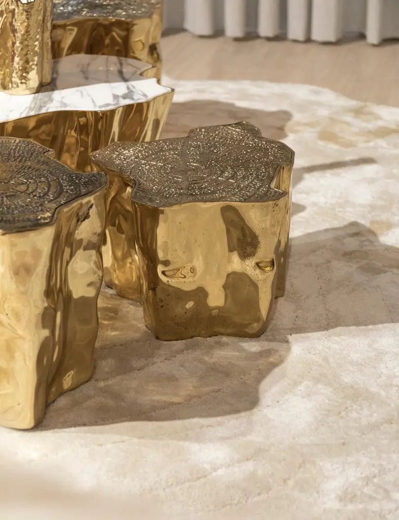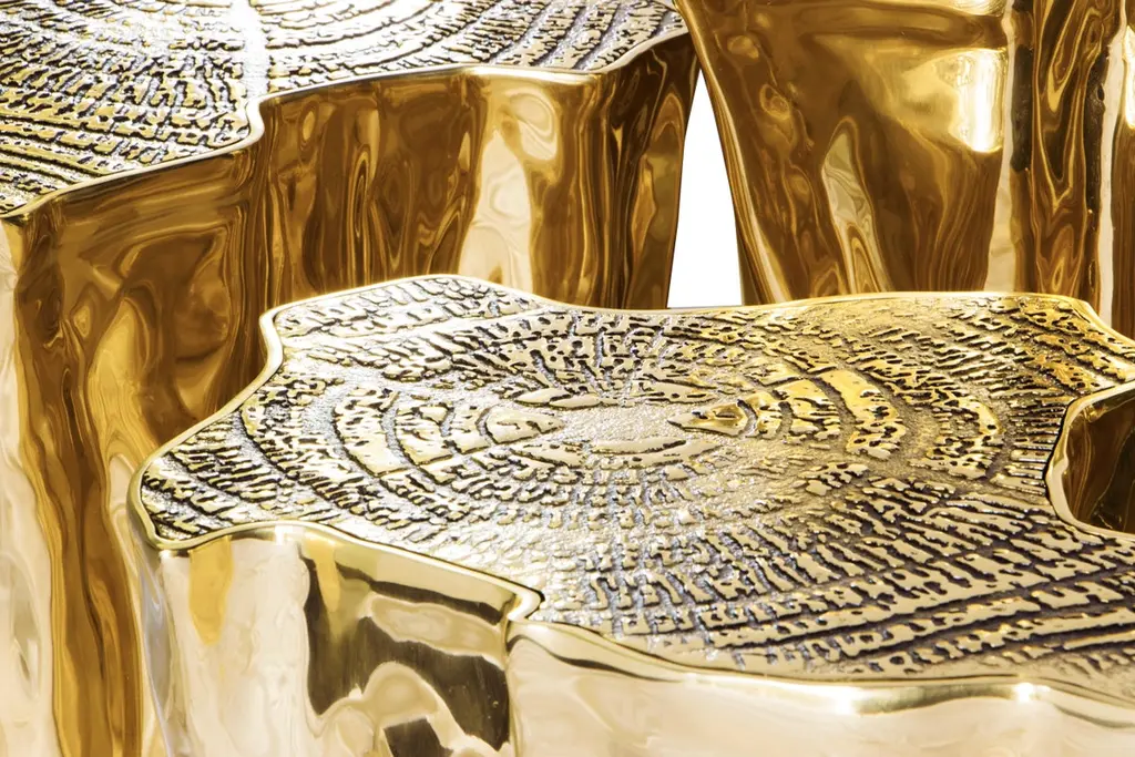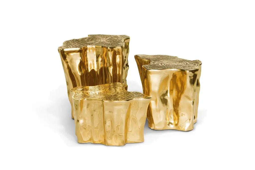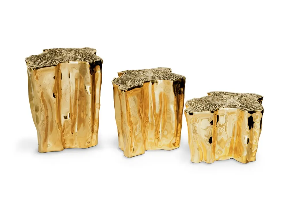 The mystic behind the name inspires Eden. A slice of the tree of life that fell from the Garden of Eden, this accent coffee table set awakens desire and curiosity with its intriguing cut. Born from master artisans and the ancient technique of polished cast brass, these statement design pieces incorporate nature-inspired design with industrious welding techniques, being manually assembled, making each piece unique. With delicate lines and bold details, a manually engraved top exposes the heart of a golden tree, boasting a sinuous gold plated base that stood the test of time. It is available in groups of 7, 8 or 14 pieces, with different heights, for unexpected combinations. The remarkable and already time-honoured piece, Eden coffee table series combine with both contemporary and modern design styles, classy rooms waiting for superior craftsmanship and iconic design.