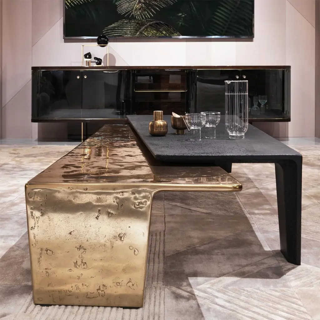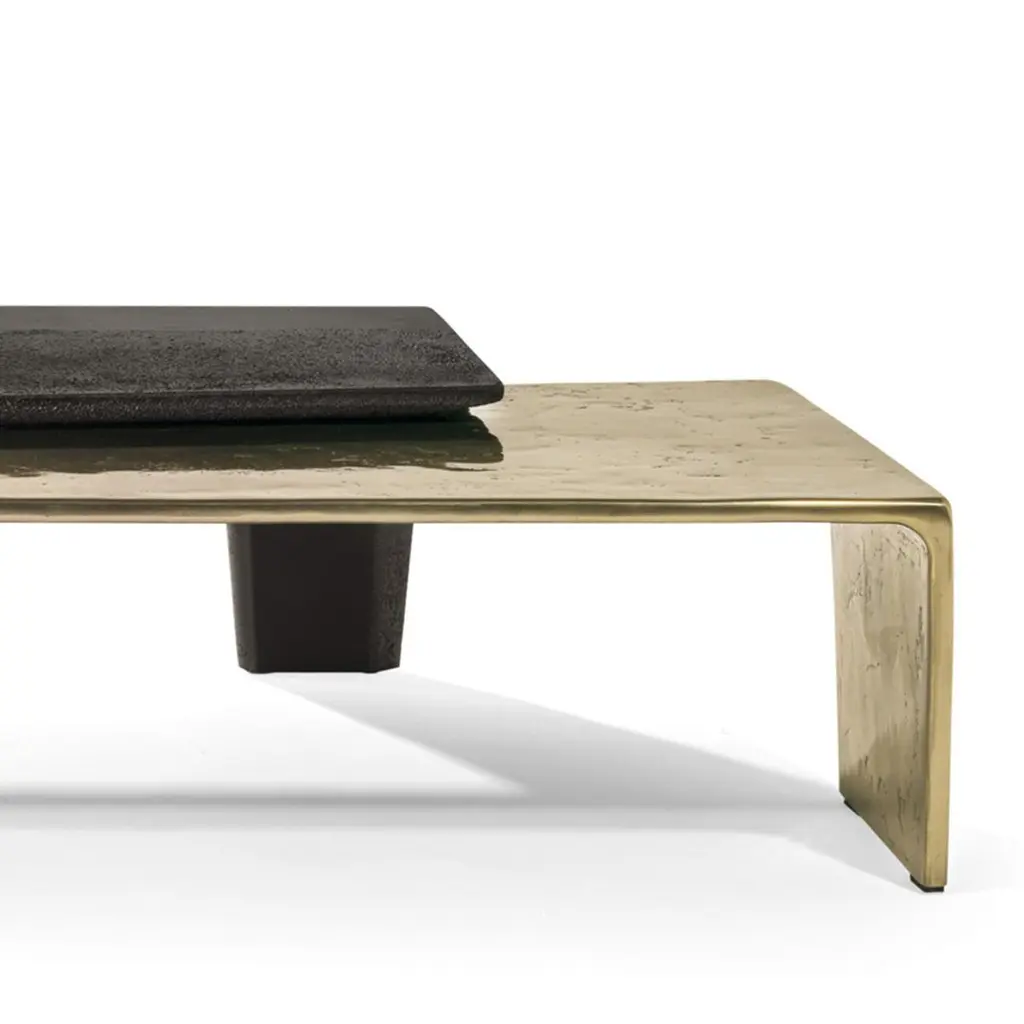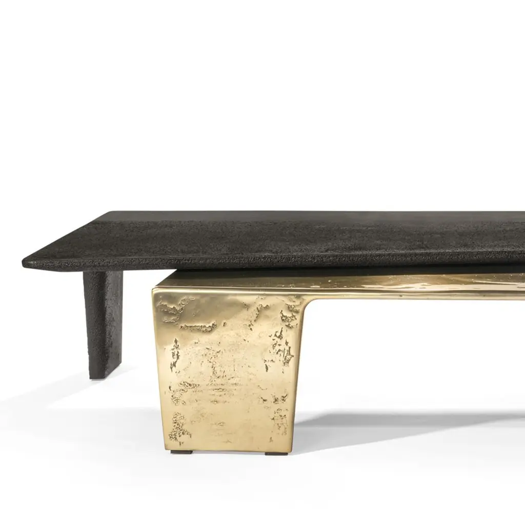 Coffee Table Edena, one part in solid raw casted Aluminium polished and lacquered in gold finish and the other part in concrete in black matt finish.