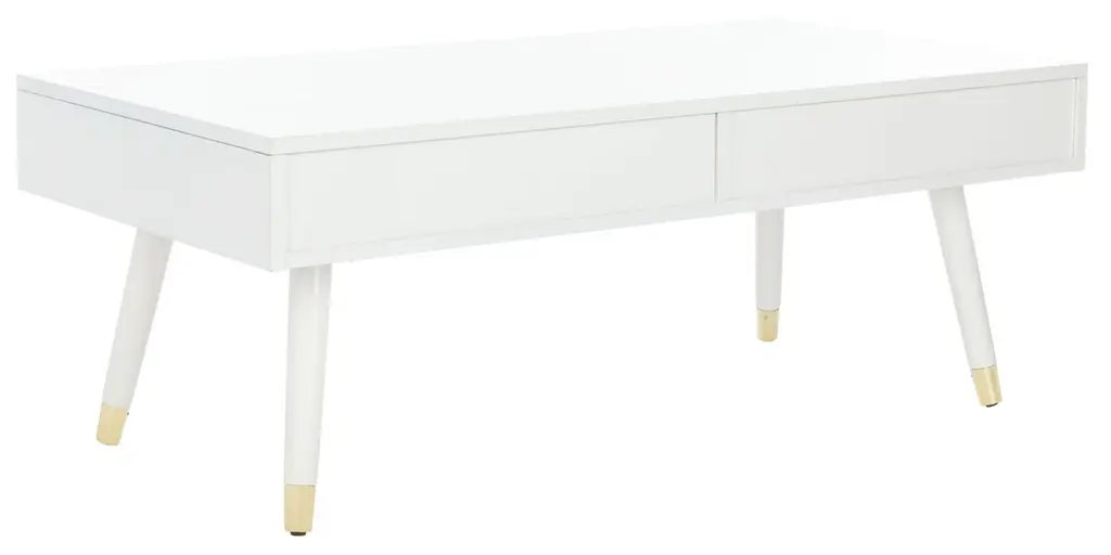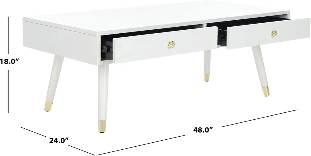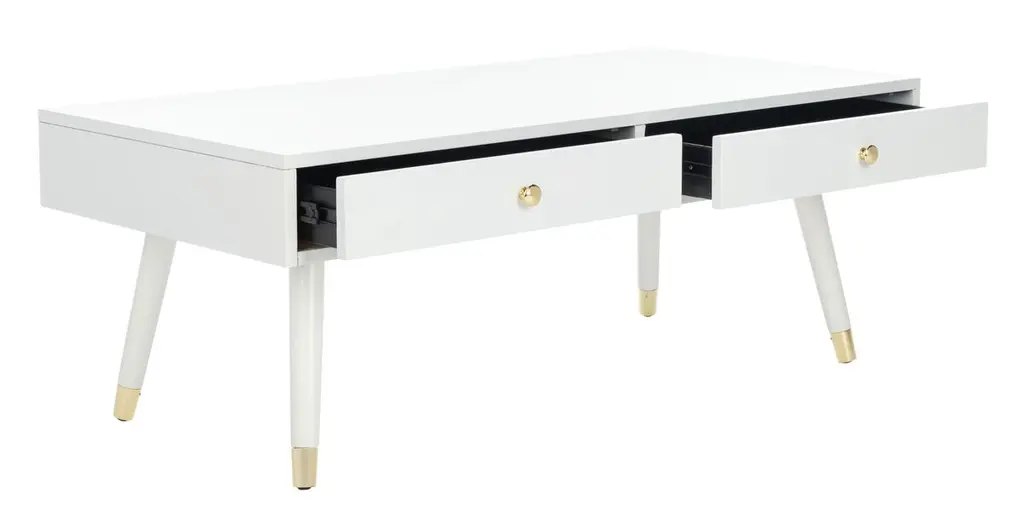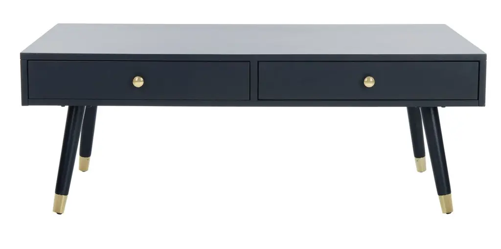 This cocktail table's splayed legs and sleek silhouette are an homage to Mid-Century Modern finesse, while the golden foot caps and hardware provide timeless glamour. The two drawers offer always-welcome storage.