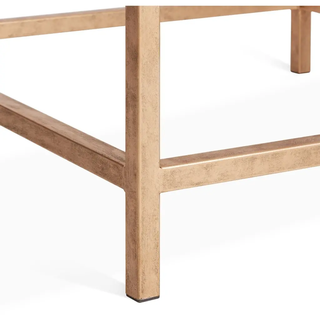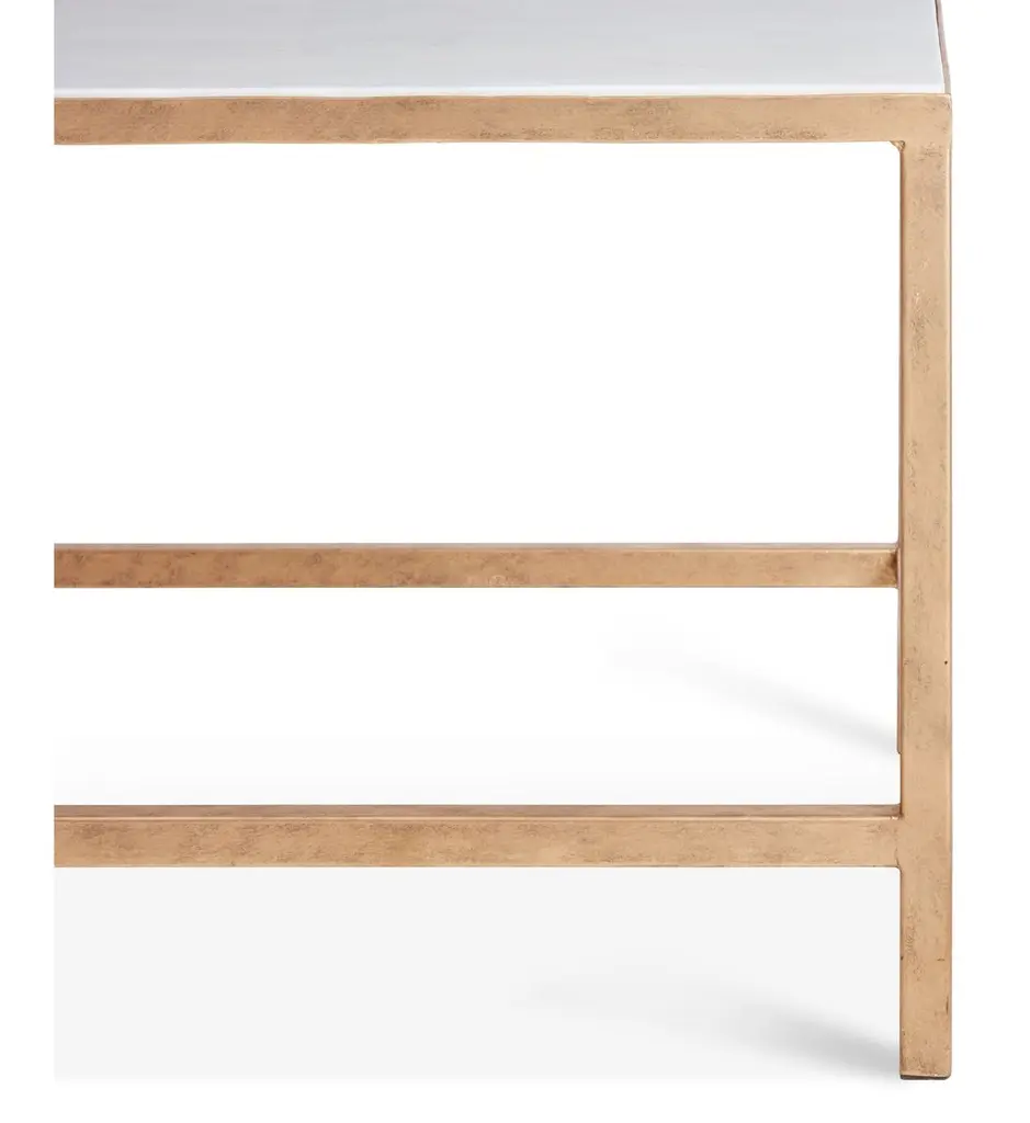 Designed by us and available only at One Kings Lane: A sleek, sophisticated addition to any space, this clean-lined coffee table pairs an antiqued gold-finished base with a white marble top.