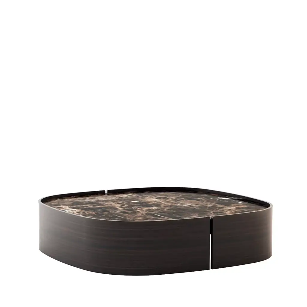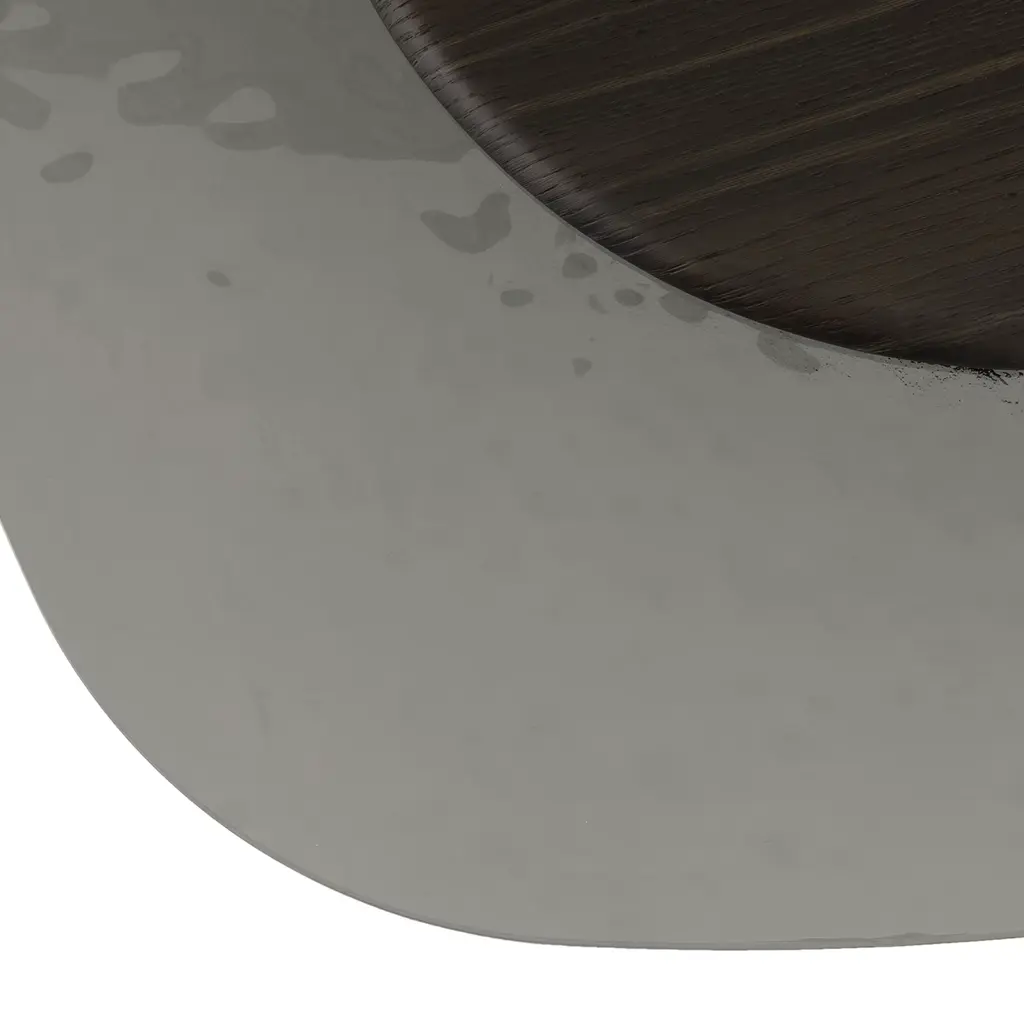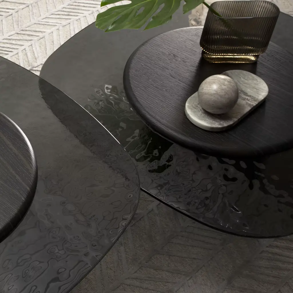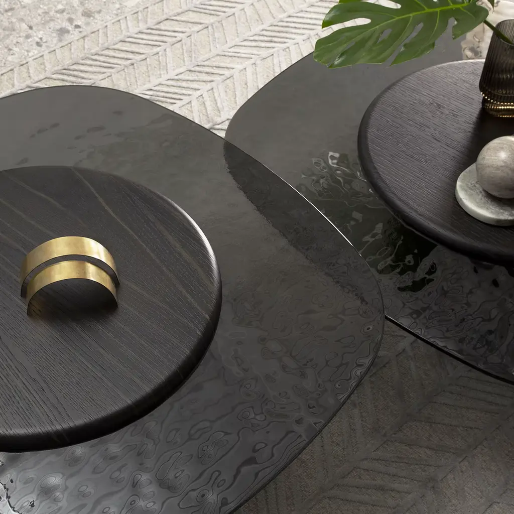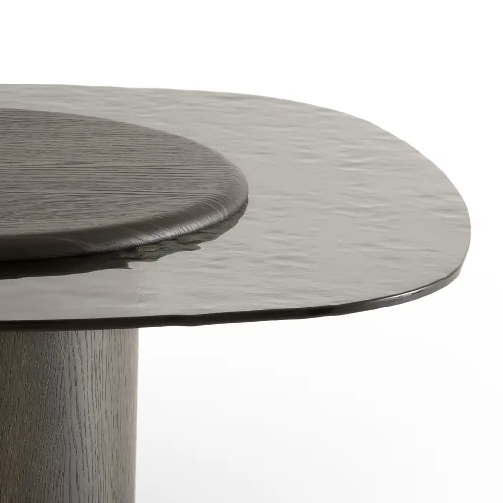 Exuding modern elegance and artisanal craftsmanship, this coffee table is a testament to sophisticated design. Its cylindrical base, crafted from oak veneer MDF in a lavish Laguna finish, establishes a distinguished ambiance in any living space. The semi-transparent smoked glass top, delicately hammered to create a textured allure, accentuates its ethereal charm. A secondary level of Laguna oak veneer MDF boasts a pressed membrane finish, enriching the table with depth and tactile appeal.