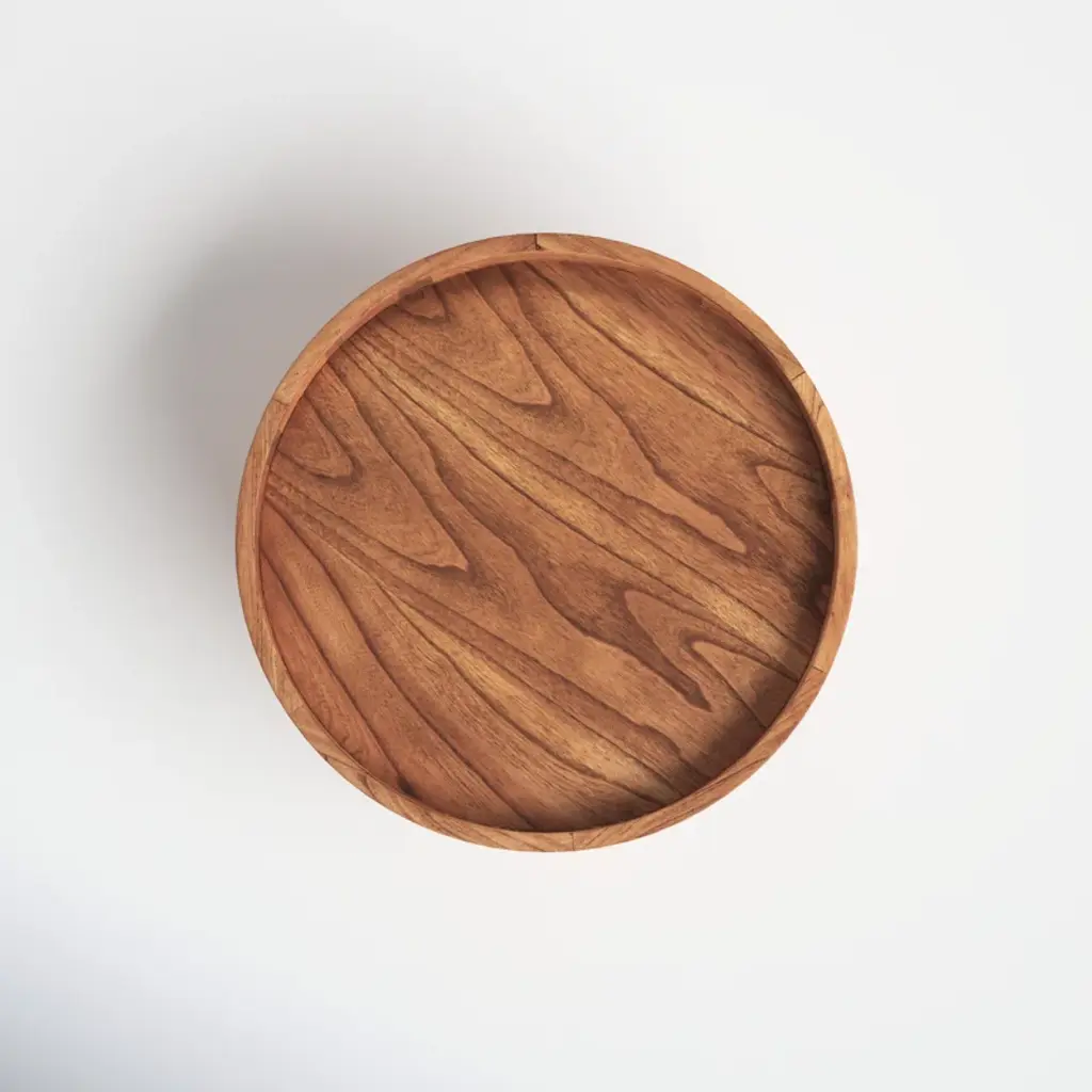 Anchor your living room in effortlessly cool style with this round coffee table. It's crafted from solid and engineered wood with a warm brown finish, and it sits on three cylindrical legs. We love how its simple design lets your sofa and statement rug shine. Plus, its raised edge helps keep your drinks and snacks from falling off. This table measures 15'' tall and 36" wide, so it's sized just right for holding books, decor, and remotes.