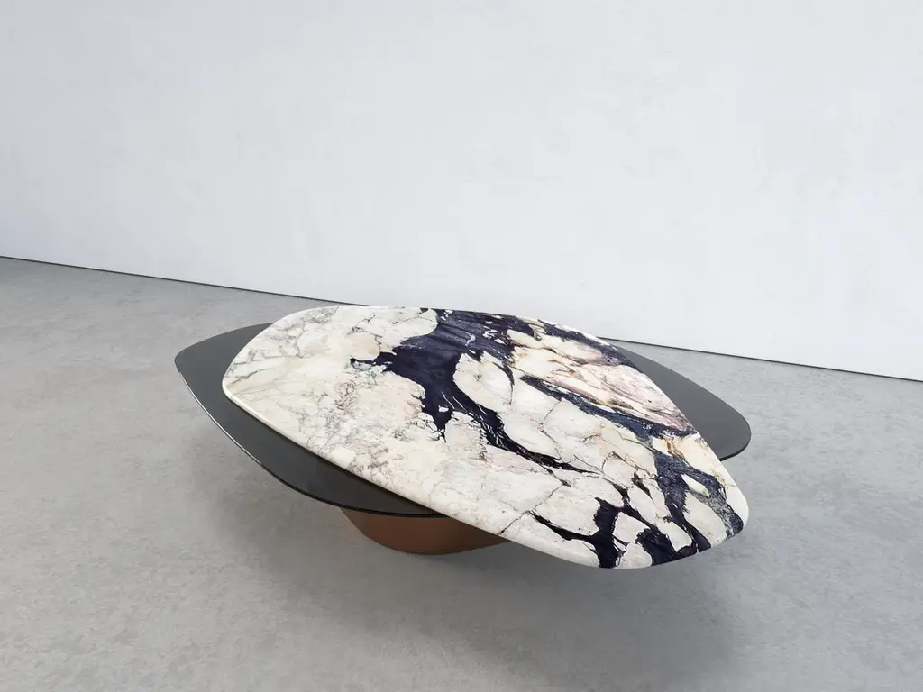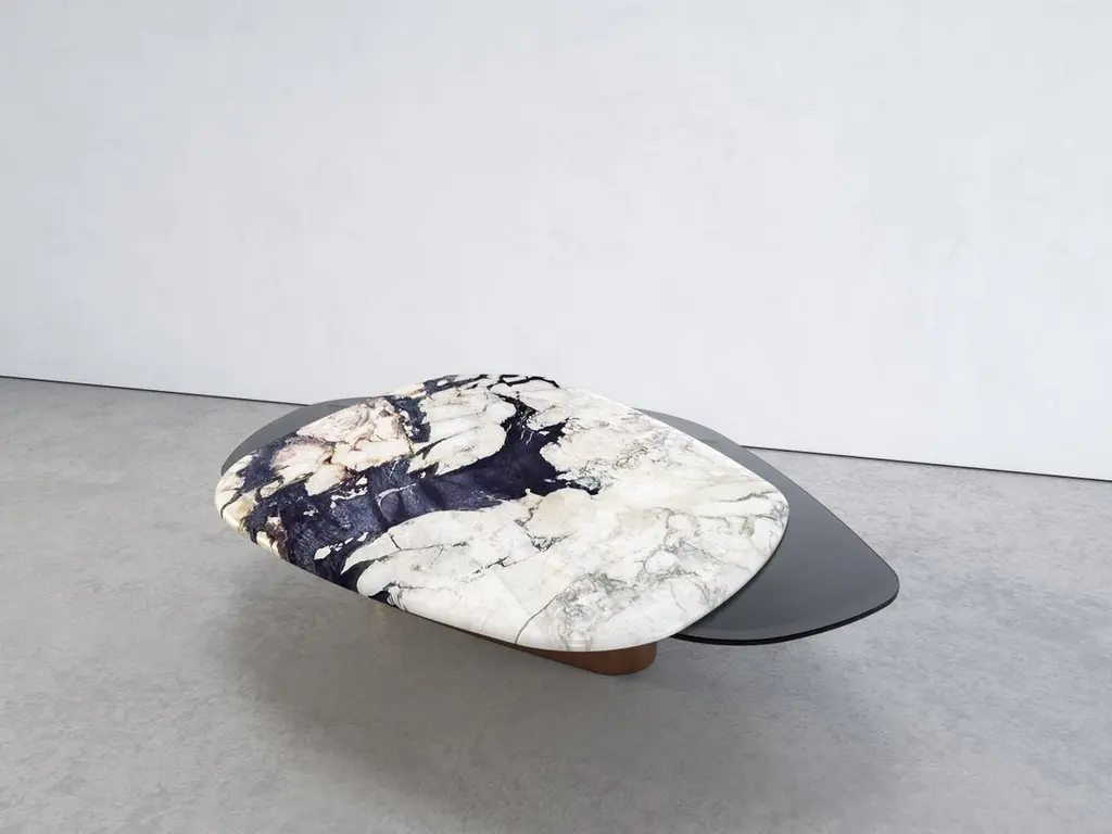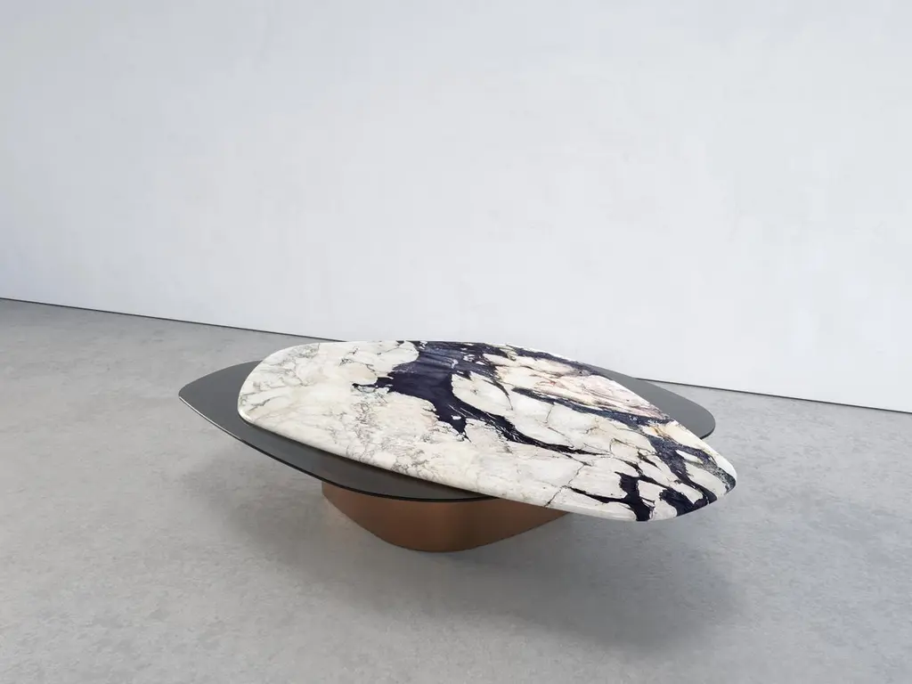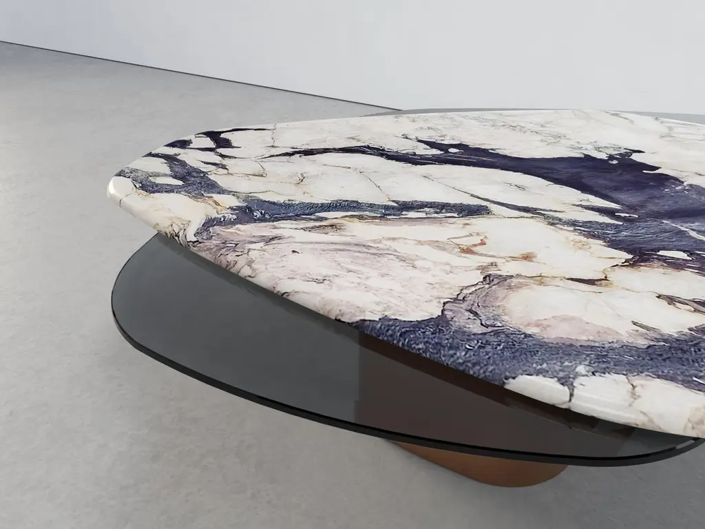 The elements VII coffee table, 1 of 1 by Grzegorz MajkaEdition 1 of 1Dimensions: W 172.7 x D 119.3 x H 35.5 cmMaterials: Glass, quartz and steel“The Elements VII” - contemporary center coffee table ft. Calacatta Vagli Viola marble and tempered smoked glass tops with solid bronze base in satin brown finish. One of a kind and one of the series of various coffee tables presented in this collection.Created of the two totally different shapes, structures reveals some symbiotic influence between each other.One delicate – second more sharp, one smooth – second chaotic, correlating in a way as one could not create the complete piece without the other.Grzegorz Majka is a self-taught Polish artist who explores the concepts of modularity, sculptural form, and artisanal processes in the design of furniture and lighting. His work seamlessly blends craft and contemporary design, incorporating high-quality noble materials like natural stone, wood, metals, and hand-blown glass. Guided by a deep respect for the inherent character of materials, Grzegorz highlights natural irregularities, textures, and patterns - veins in stone, the living patina of untreated metals, the organic feel of brushed surfaces. These elements are not hidden but embraced, inviting collectors on a sensory journey through touch and time.His studio practice focuses on handcrafted limited-edition furniture that is not only functional, but also living, authentic, collectible art.