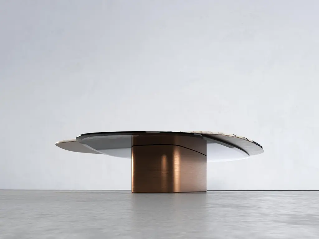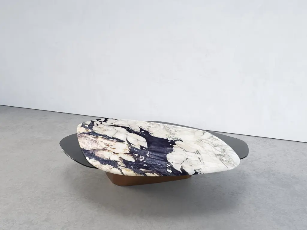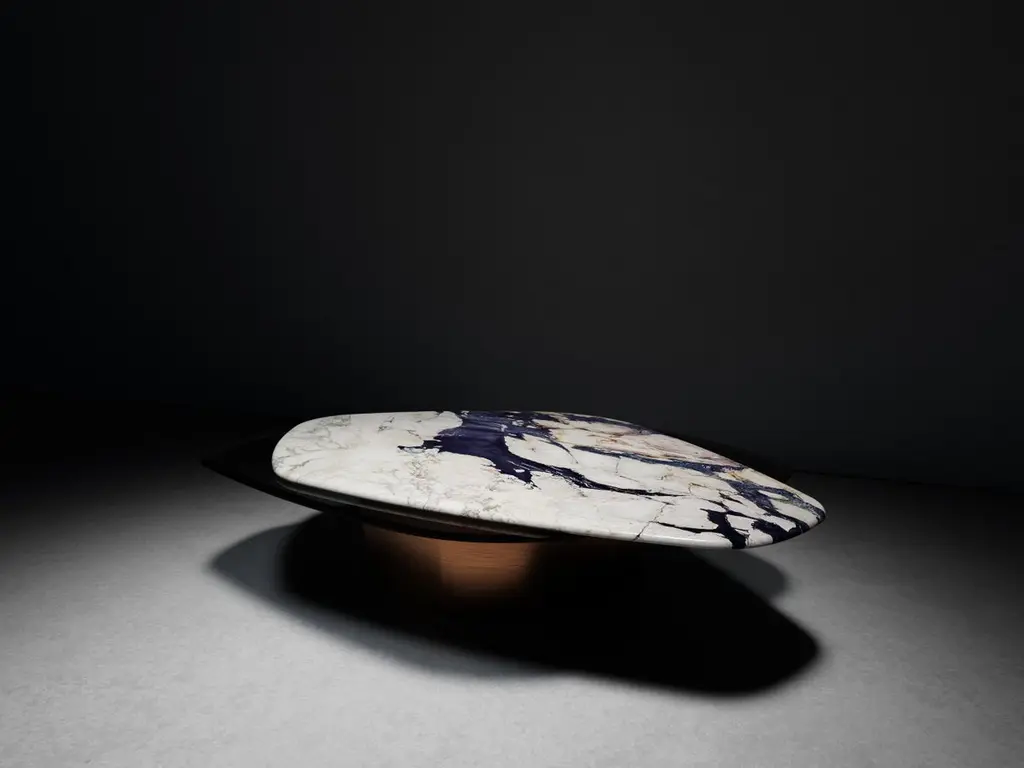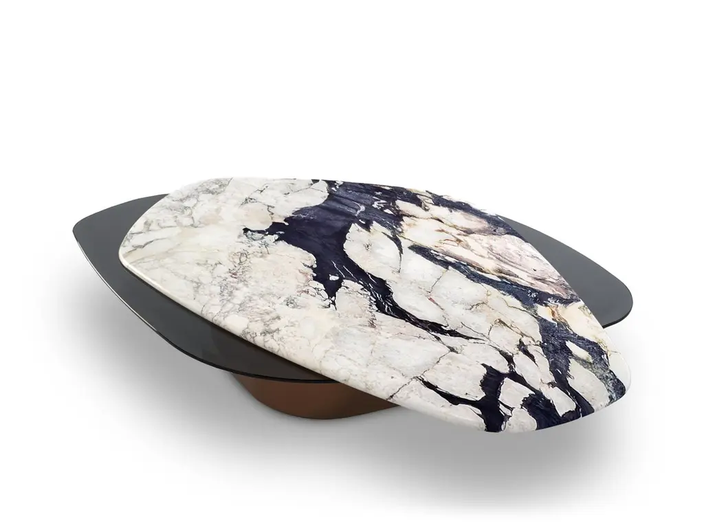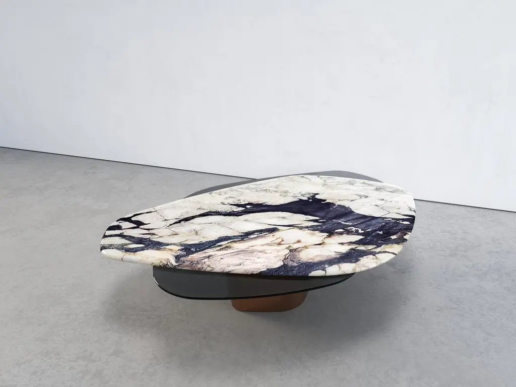 The elements VII coffee table, 1 of 1 by Grzegorz MajkaEdition 1 of 1Dimensions: W 172.7 x D 119.3 x H 35.5 cmMaterials: Glass, quartz and steel“The Elements VII” - contemporary center coffee table ft. Calacatta Vagli Viola marble and tempered smoked glass tops with solid bronze base in satin brown finish. One of a kind and one of the series of various coffee tables presented in this collection.Created of the two totally different shapes, structures reveals some symbiotic influence between each other.One delicate – second more sharp, one smooth – second chaotic, correlating in a way as one could not create the complete piece without the other.Grzegorz Majka is a self-taught Polish artist who explores the concepts of modularity, sculptural form, and artisanal processes in the design of furniture and lighting. His work seamlessly blends craft and contemporary design, incorporating high-quality noble materials like natural stone, wood, metals, and hand-blown glass. Guided by a deep respect for the inherent character of materials, Grzegorz highlights natural irregularities, textures, and patterns - veins in stone, the living patina of untreated metals, the organic feel of brushed surfaces. These elements are not hidden but embraced, inviting collectors on a sensory journey through touch and time.His studio practice focuses on handcrafted limited-edition furniture that is not only functional, but also living, authentic, collectible art.