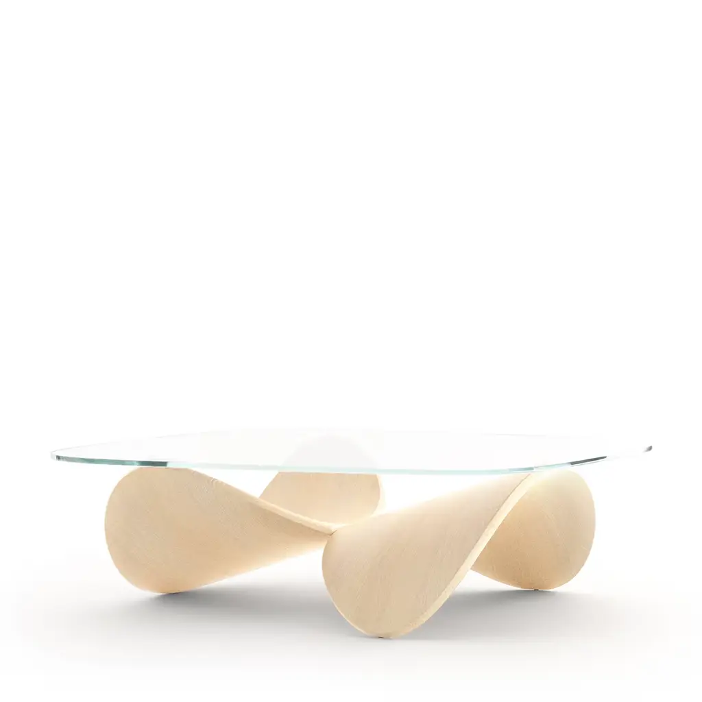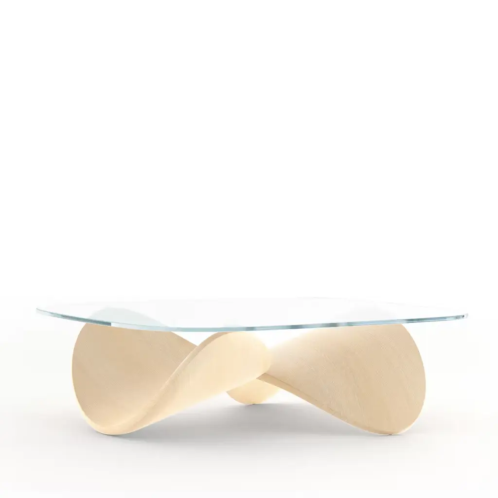 A refined expression of uniqueness and bold character, this coffee table doubles as furniture and sculpture. Boasting two identical shells made of steam-bent solid ash wood adorned with a water-based natural lacquer, and a toughened glass top, it belongs to an exclusive numbered series of bespoke designs. Please consult the Concierge for further information.