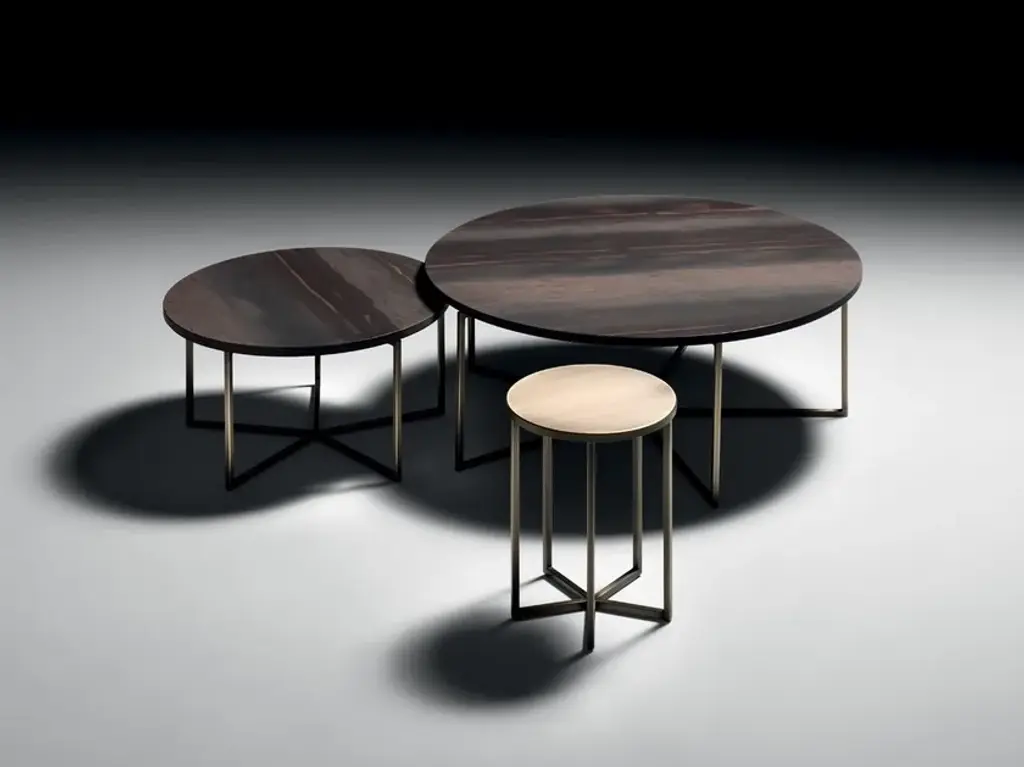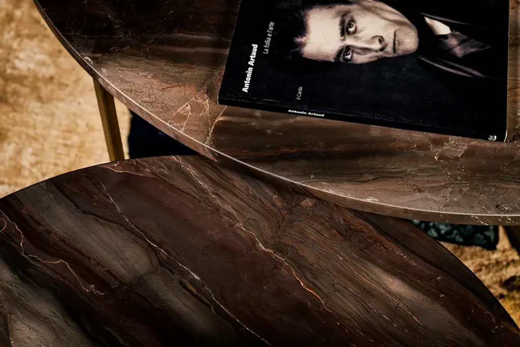 Elliot is a low stone and metal coffee table. Round tables with structure in metal, matt dark bronze finishing. Top in Elegant Brown stone, in matt Calacatta Vagli Oro marble, or in matt Port laurent marble. Matt dark bronze or polished gold finishing top only for the small version. The metal structure of the elegant Elliot tables is sinuous and graceful around the Elegant Brown stone top, in the matt Calacatta Vagli oro marble top, or in matt Port Laurent marble top, together with bronze matt dark finishing. A harmony of forms which gives both practicality and sophistication, leaving room for multiple possibilities of use and location.