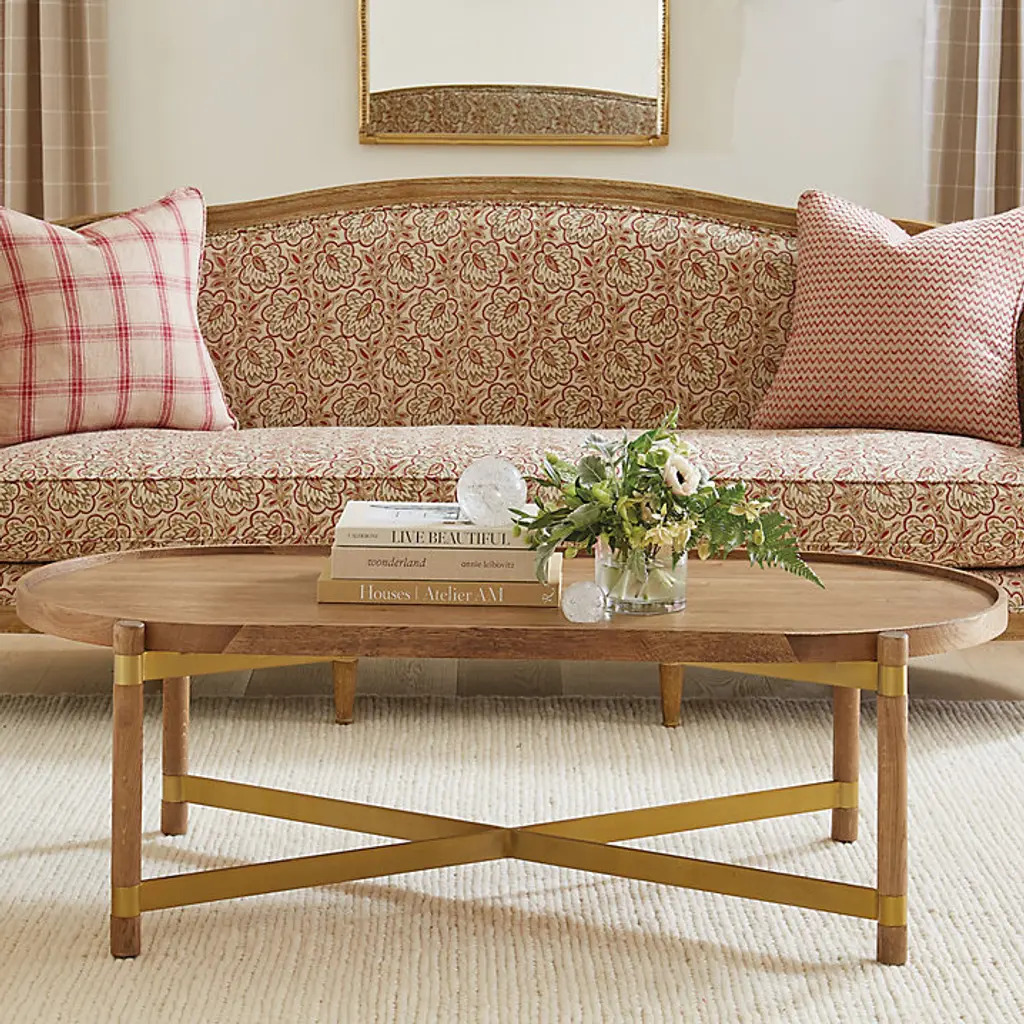 Our Elliot Coffee Table is a handsome blend of rich materials, tones, and textures. The lozenge-shaped top and round legs are crafted oak wood and finished in a medium oak stain to bring out the wood’s natural character and grain. A shallow lip framing the top adds extra depth. Legs are collared at the top and bottom with double antique brass “X” stretches for strength and architectural dimension. Elliot Coffee Table features