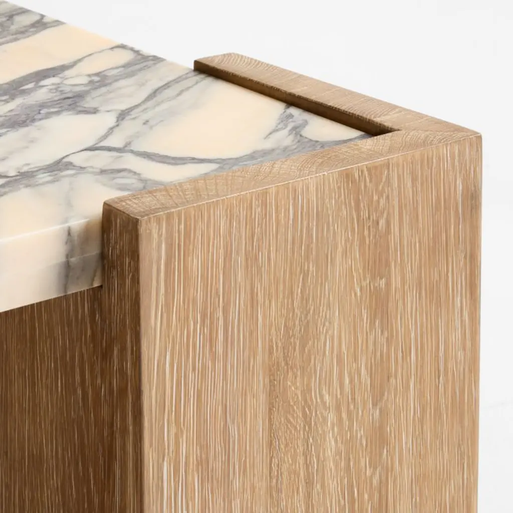 Our Elysia coffee table's simple-yet-striking design puts the beauty of wood and marble on clear display. Solid oak, wirebrushed and finished with subtle cerusing, shows off its grain in square legs. Strategically notched at the top, the legs seem to float a thick slice of Purple Breccia marble that's swirled with a captivating array of cream, charcoal grey and blush veining.Introducing The Collected Home. Our exclusive new collaboration with interior designer Jeremiah Brent is rich with bespoke details and bold individuality.