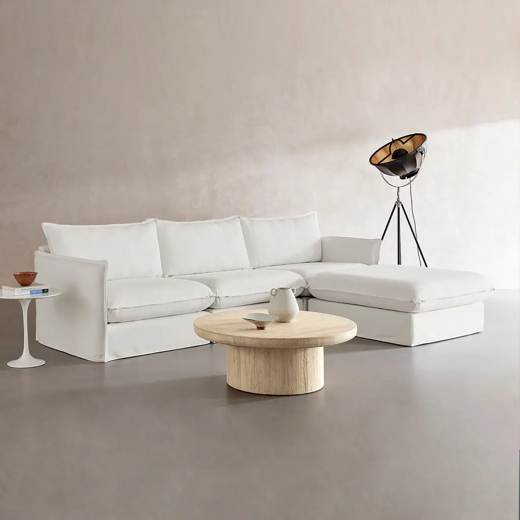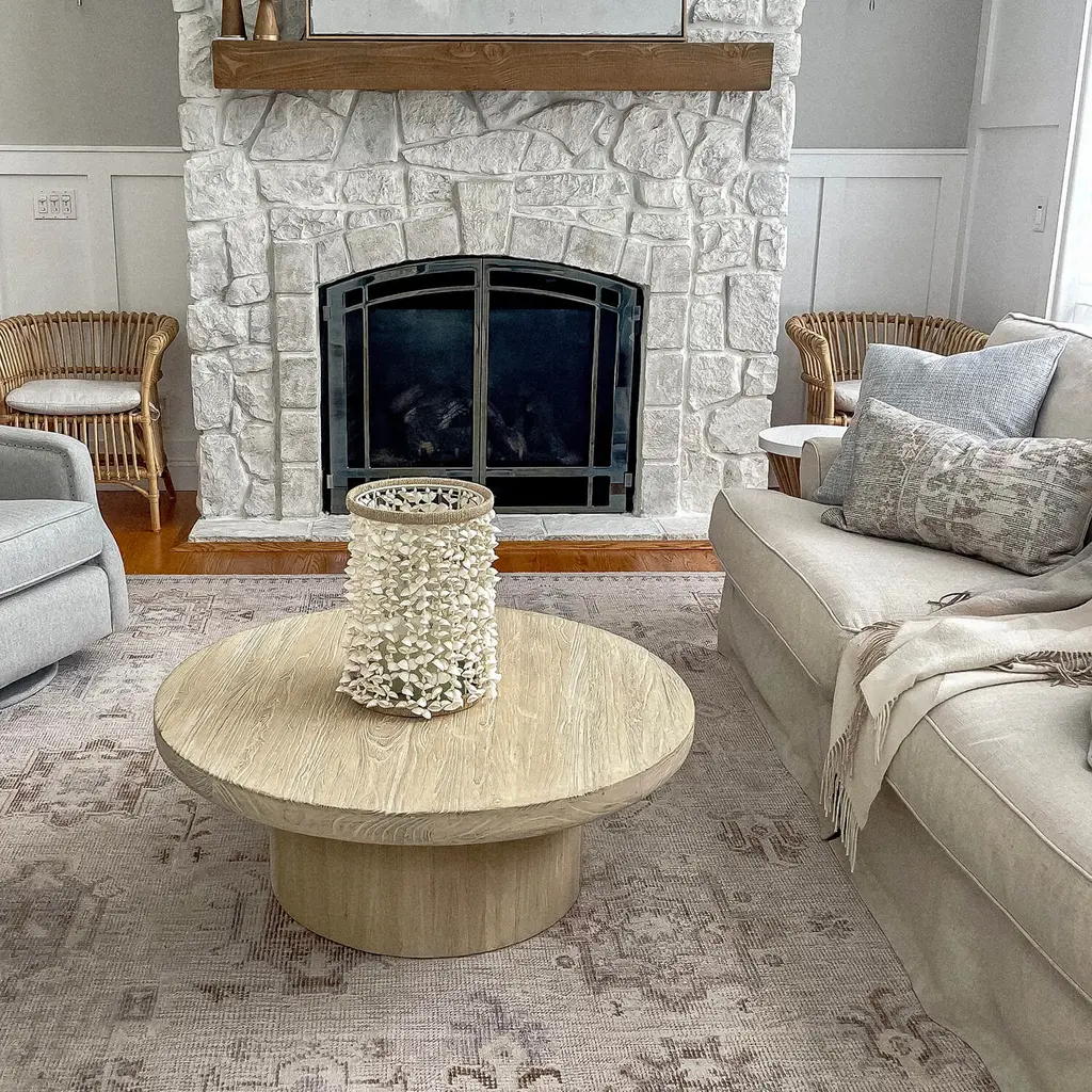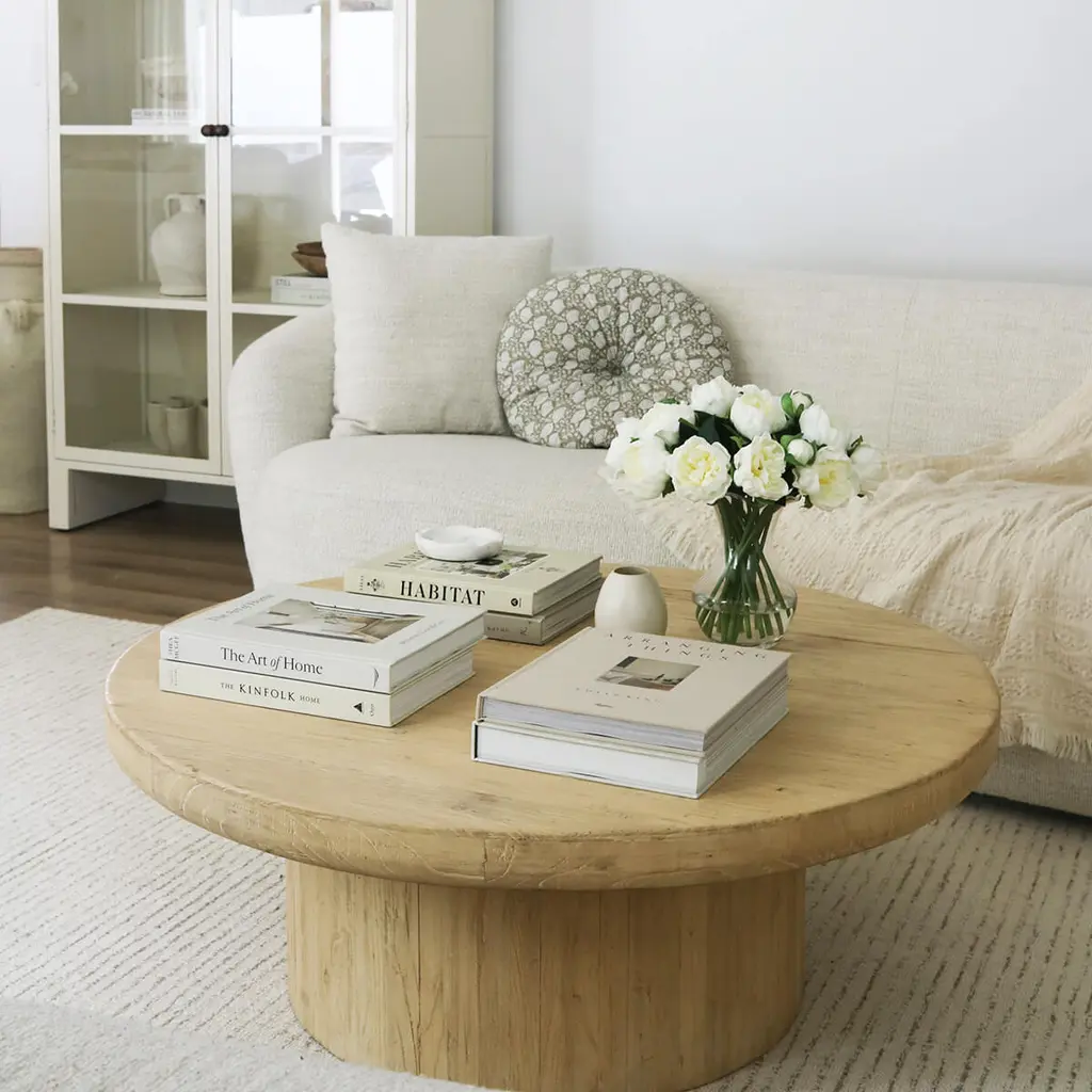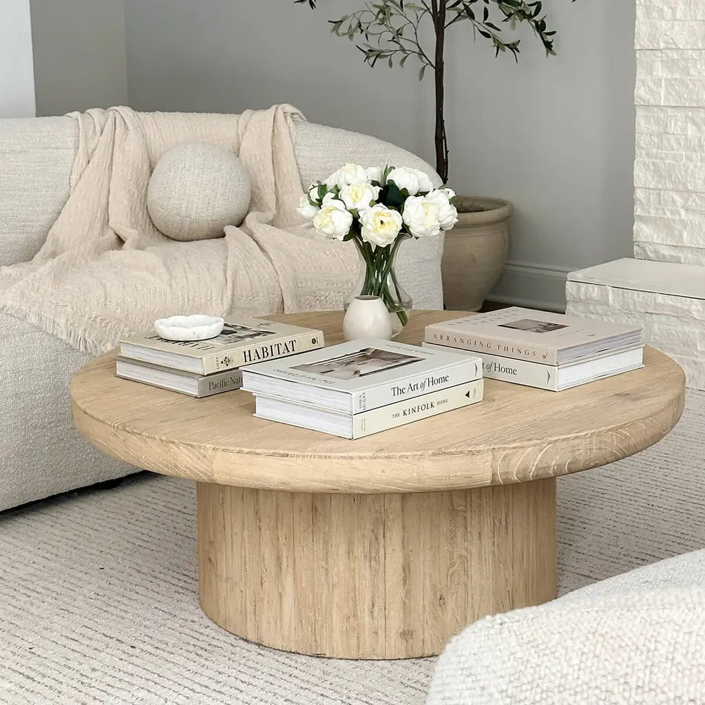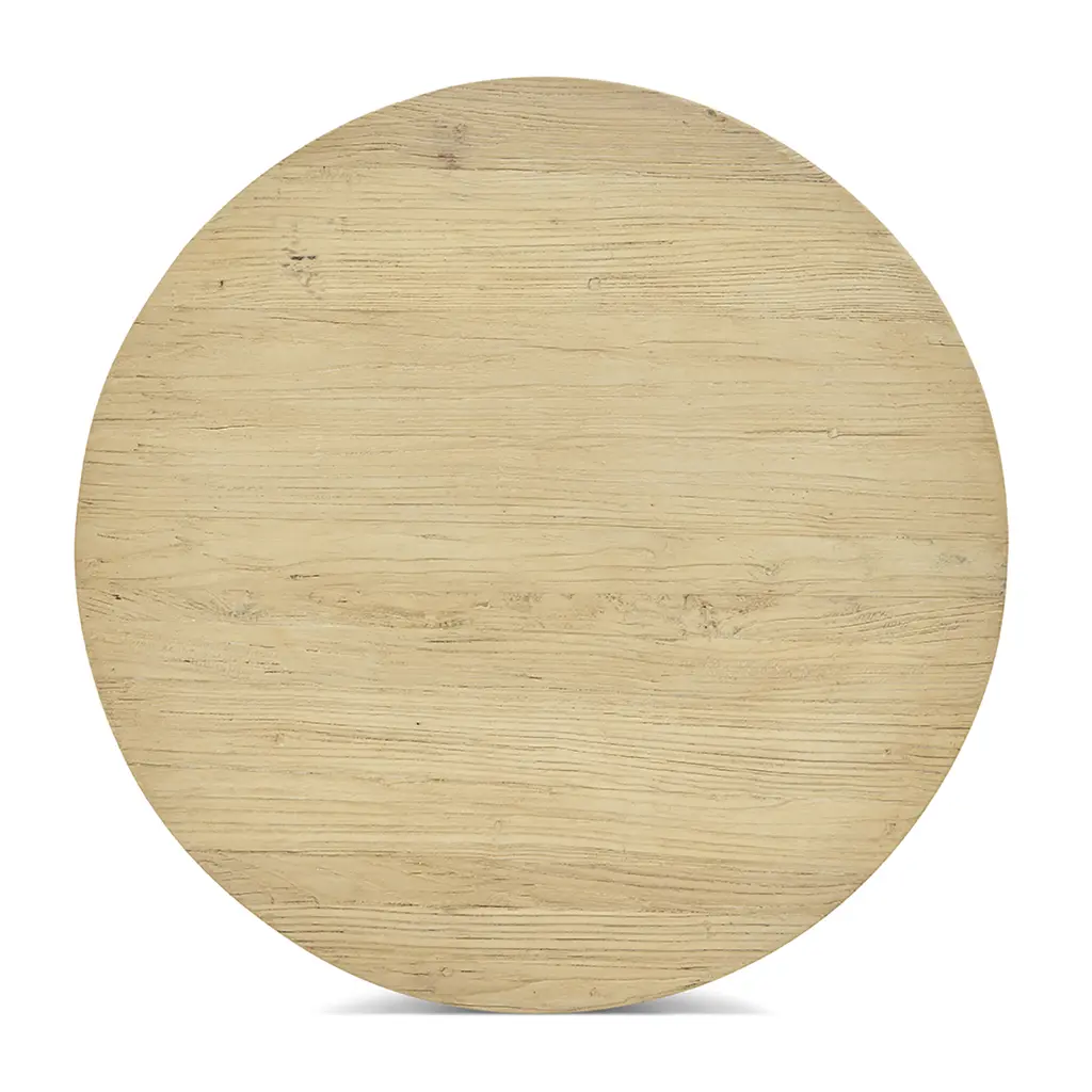 The EM Wabi-Sabi Round Light Natural Reclaimed Wood Coffee Table, complete with its gracefully rounded pedestal base, brings an honest sense of tranquility and togetherness to a living space. The soft, natural wood tone creates an atmosphere of serenity and earthy charm, inviting those gathered around it to relax and enjoy the moment. Every table is handcrafted from wood, and to preserve its natural character and inherent charm, it may occasionally be adorned with occasional knots, imperfections, or fissures.