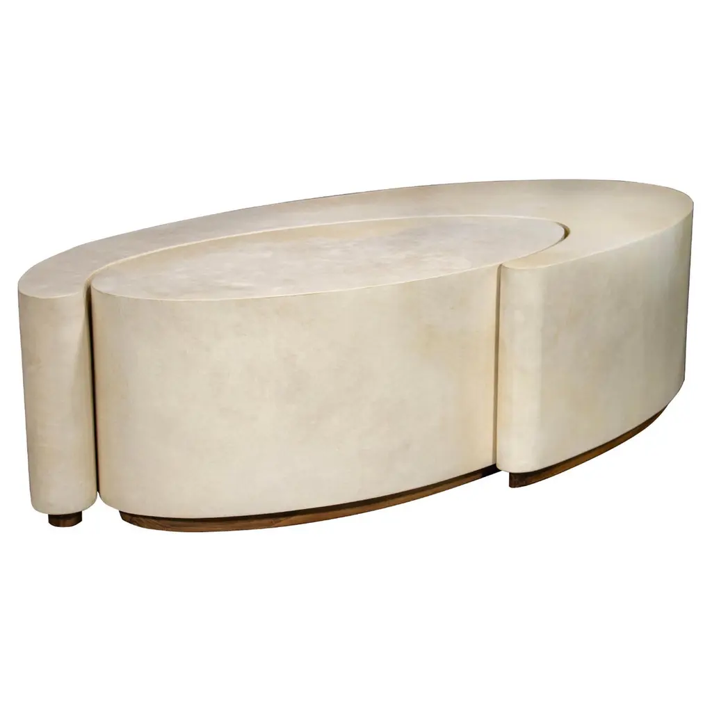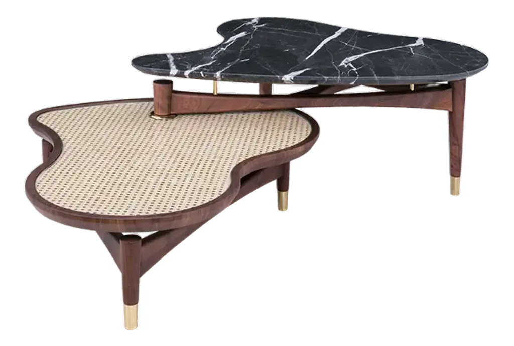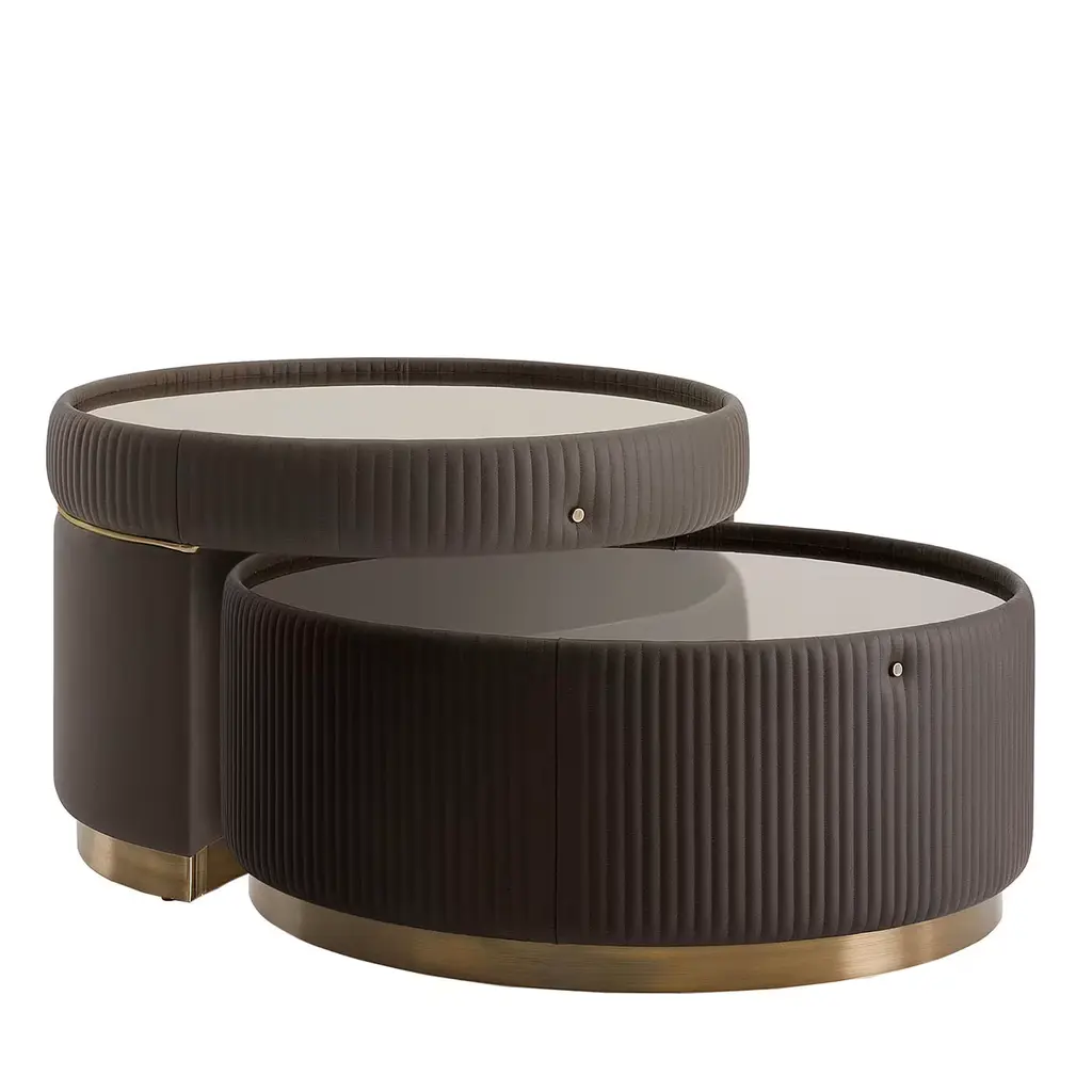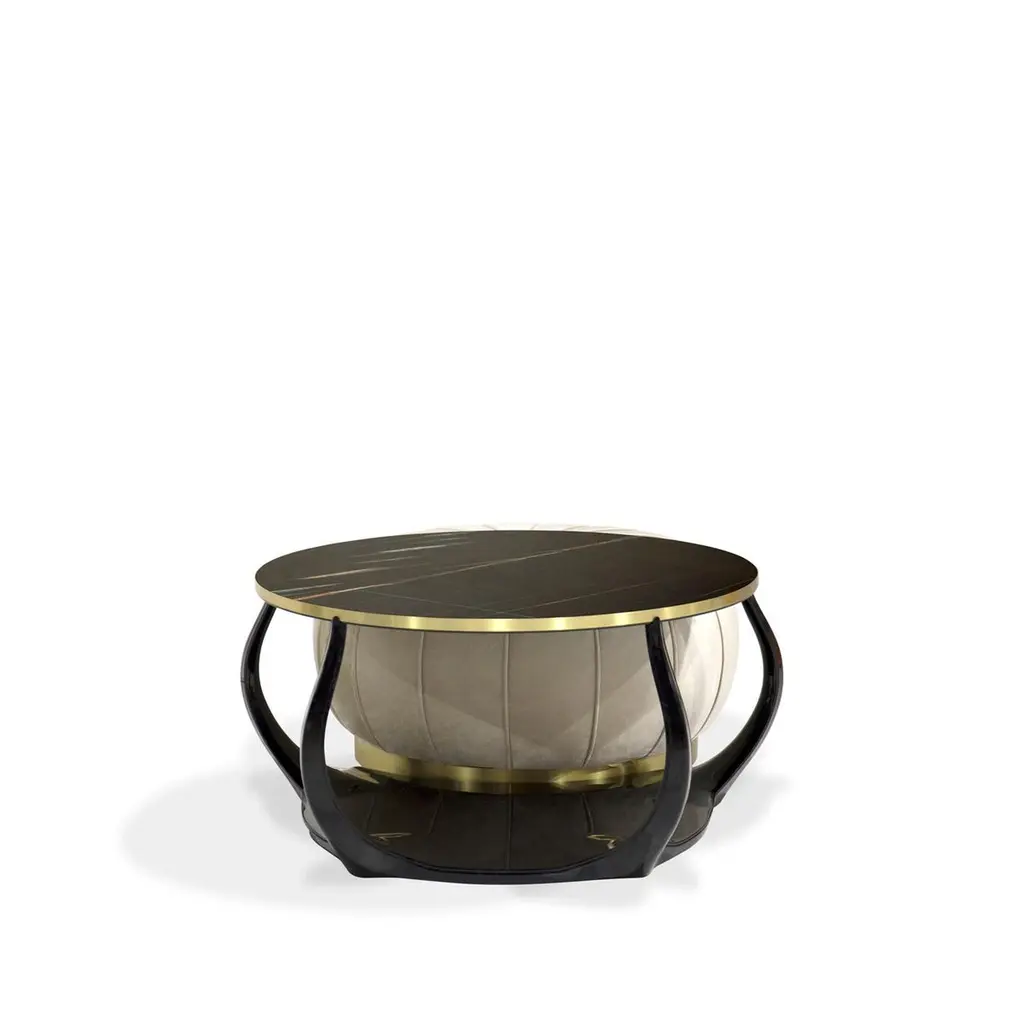 High gloss black lacquered limbs clasp a Sahara Noir marble top and a seamed round upholstered ottoman with a polished brass base to compose the intriguing Embrace cocktail table ottoman combo.