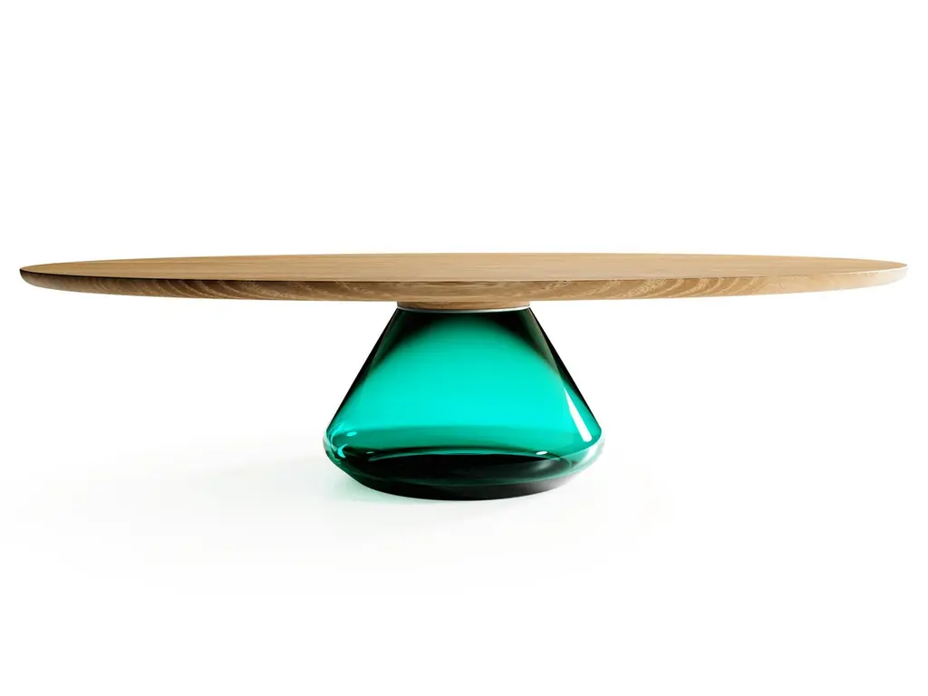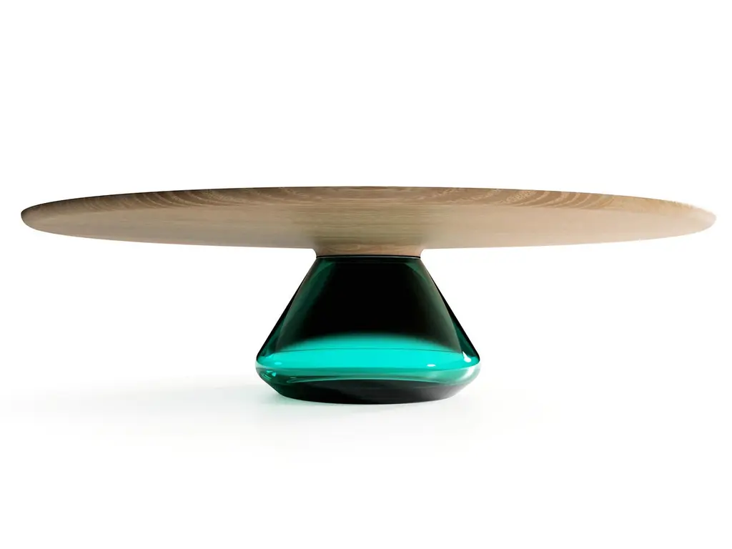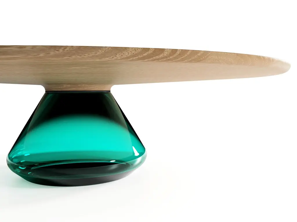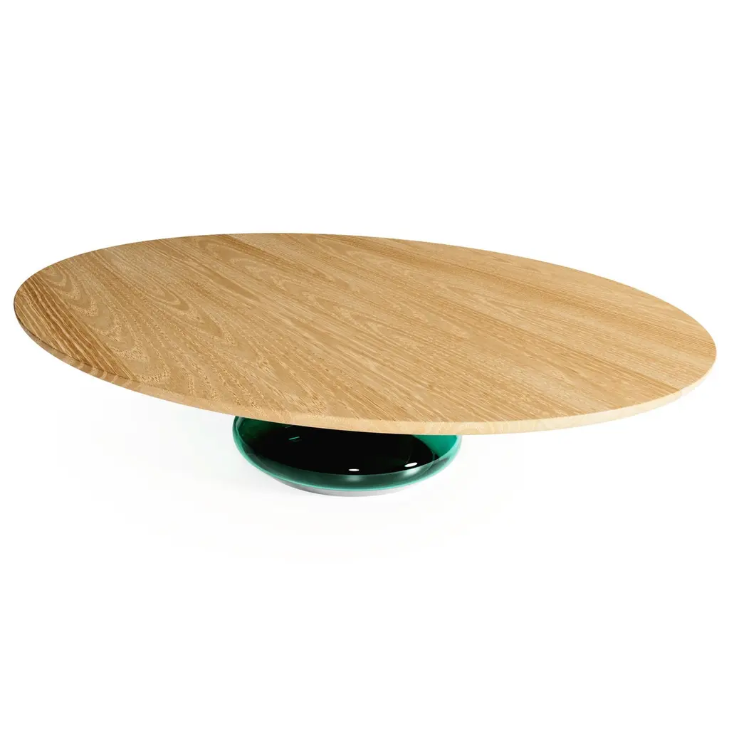 The emerald Eclipse I, limited edition coffee table by Grzegorz MajkaLimited edition of 8Dimensions: 54 x 48 x 14 inMaterials: Glass, oakThe total eclipse of every interior? With this amazing table everything is possible as with its Minimalist style it will definitely eclipse all things around, spreading its hidden beauty. Focusing on arresting things not seen from the very first perspective inspired to create the piece of work called The Eclipse. When finally noticed attracting all the recipients by its unique form.New application and new ideas? Why not to use the glass but the other way round as it is typically done with Classic tables, glass top and the glass base?As a result of this idea we can admire the solid and beautiful tempered smoked glass top sustained by glamorous handmade glass base. When joined together the exclusive and elegant coffee table came to light.Grzegorz Majka is a self-taught Polish artist who explores the concepts of modularity, sculptural form, and artisanal processes in the design of furniture and lighting. His work seamlessly blends craft and contemporary design, incorporating high-quality noble materials like natural stone, wood, metals, and hand-blown glass. Guided by a deep respect for the inherent character of materials, Grzegorz highlights natural irregularities, textures, and patterns - veins in stone, the living patina of untreated metals, the organic feel of brushed surfaces. These elements are not hidden but embraced, inviting collectors on a sensory journey through touch and time.His studio practice focuses on handcrafted limited-edition furniture that is not only functional, but also living, authentic, collectible art.