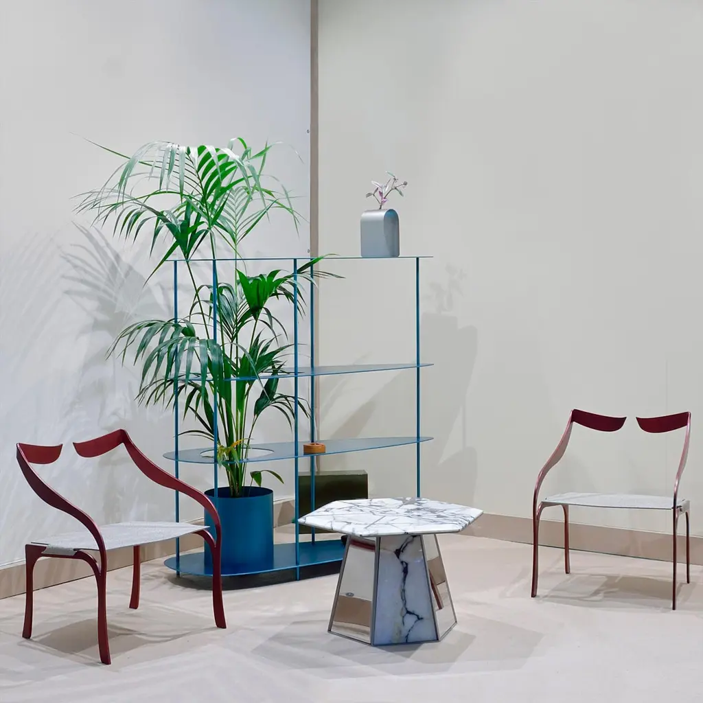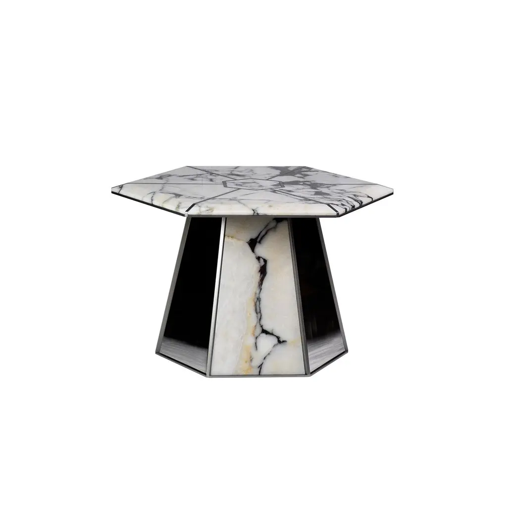 Emerso Calacatta Marble and Titanium Coffee Table by WM Metal DesignDimensions: D 70 x H 44 cm. Materials: Calacatta Viola marble, titanium, stainless steel.EMERSO is a tribute to nature, shaven but still alive.The table, dedicated to the Living area, symbolizes solidity and resistance: visual and conceptual.The generous volumes, summarized in geometric shapes, are inspired by a fertile nature, which despite the inattention of man, will continue to emerge and emerge. From this ideology comes the name of the product: EMERSO.As the most solid roots continue to emerge even in the most arid landscapes, likewise EMERSO becomes a solid structure, which rises continuously and visible from the base to the tabletop, strengthening the concept of vigor with the use of metal.The solid "metal roots" leave space for a geometric composition that allows us to give life to our nature, the most authentic one, the creativity.WM Metal Design is a workshop founded in 2021 in Bari, which exhibits, promotes, and produces contemporary sculptural design for designers, emerging artists, and globally established brands. The creator, William Mulas, specializing in sculpture and furniture, leads the design and production of all models with a coherent philosophical approach combining traditional and modern production technologies, result of the experience gained and constant research undertaken since 2016 within the family laboratory, dedicated to metalworking.Inspired by everything in nature and human experience, the brand creates sophisticated and unique designs, with strong symbolism and meaning, preserving metal as the main material of its creations.For WM it is fundamental to work with authentic materials, creating products that tell a story that sees people, environments, and objects as protagonists.