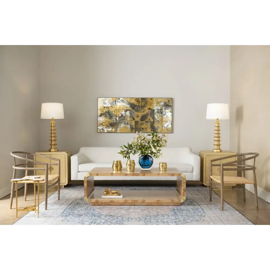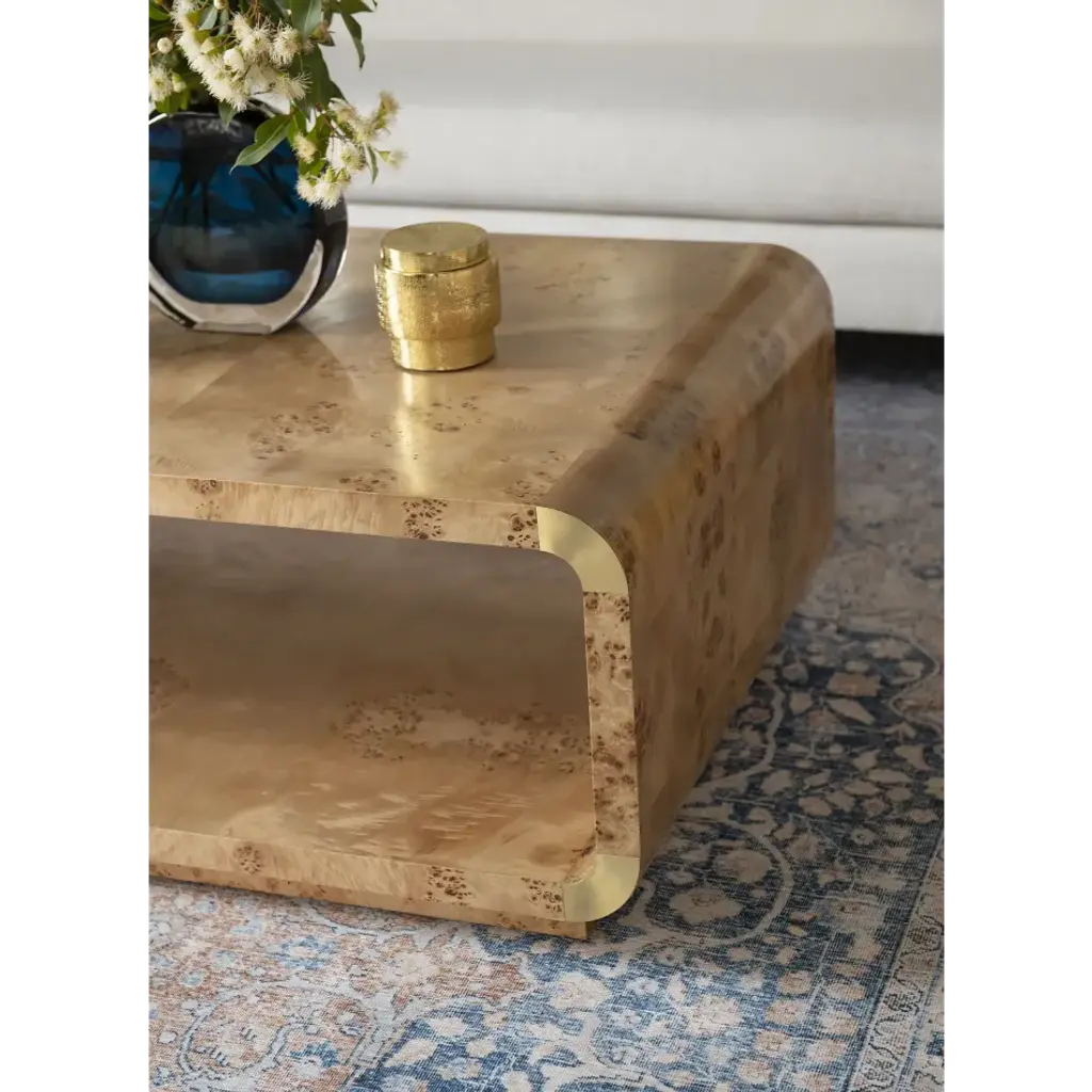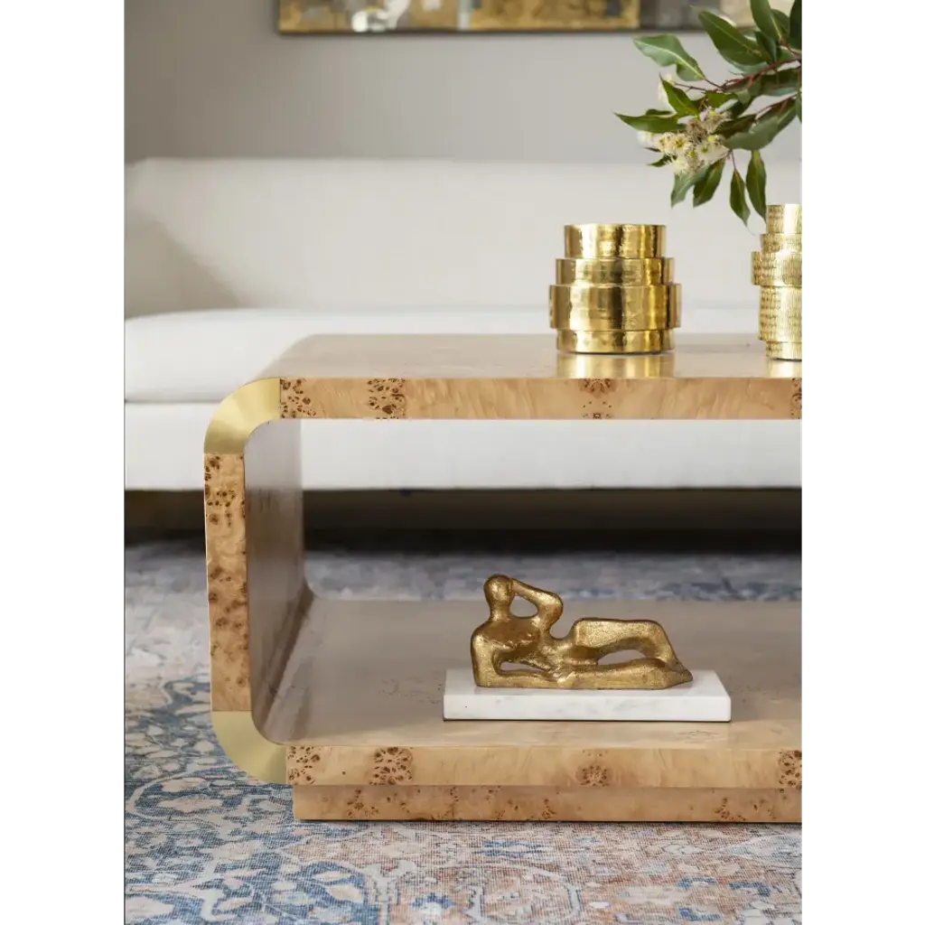 The Emil Collection combines a simple Art-Deco inspired silhouette with the mesmerizing swirling pattern of natural burl-wood veneer. Adorned with brushed-brass accents, this beautifully detailed collection exudes an elevation of richness.
