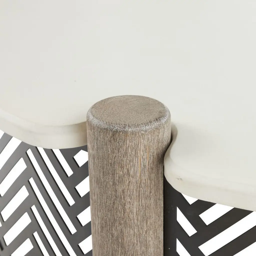 An elegant twist on an outdoor table, the Emoto features a trinity of materials. Its circular white concrete composite top is cradled at each side with supportive dowels of willow stained teak. Accented with a base of bronze-stainless steel metalwork in a herringbone pattern. Finish will vary.