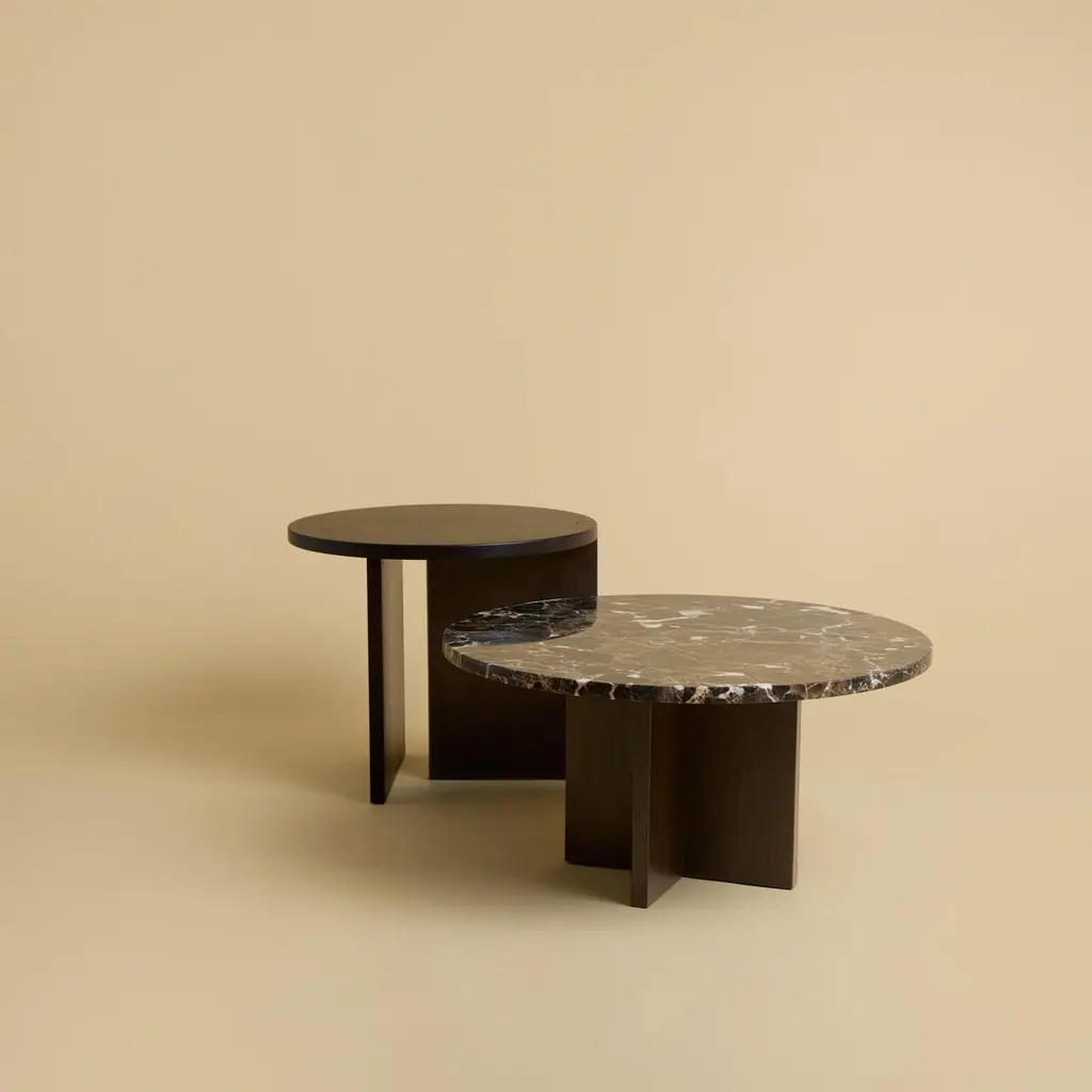 The Tinian coffee table is produced with an oak wood base and an Emperador Dark marble top. The top is circular and 60cm in diameter, while the base is obtained by gluing oak planks perpendicular to each other.The piece is designed by Lebanto and is 100% Made in Italy in small familiar workshop. Attention to details and superior material is what distinguish Lebanto products.