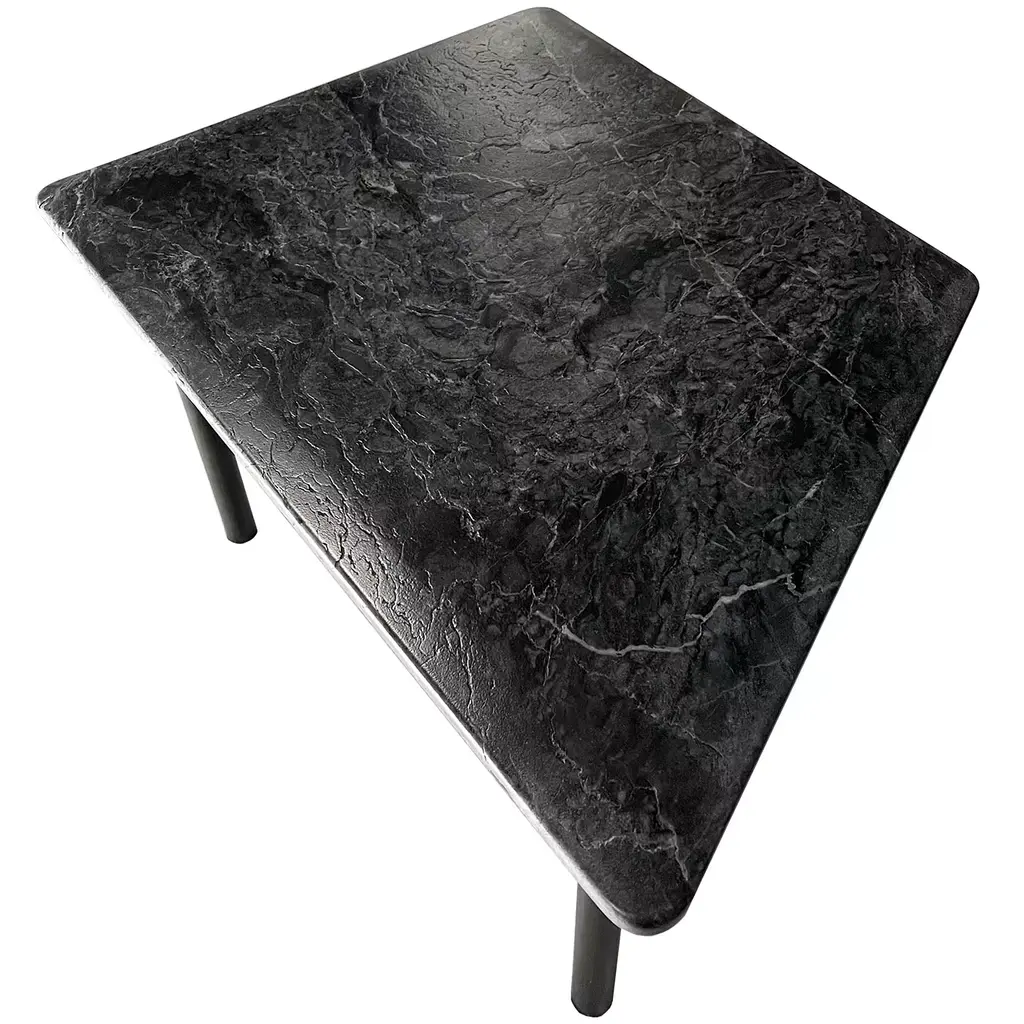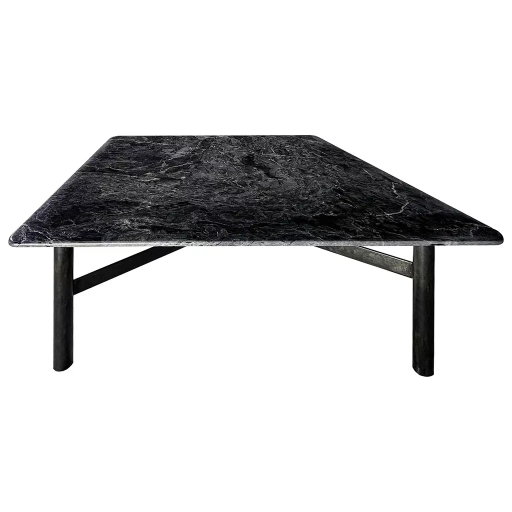 Brimming with handmade details that stress its artisan quality, this coffee table from the Eneolitica Collection brims with industrial character and quiet elegance. The dynamic iron base is hand-finished to achieve a cloudy steel look and sustains the prized top in Dark River marble. The rounded corners soften the geometric rigor of the top, completing the piece.
