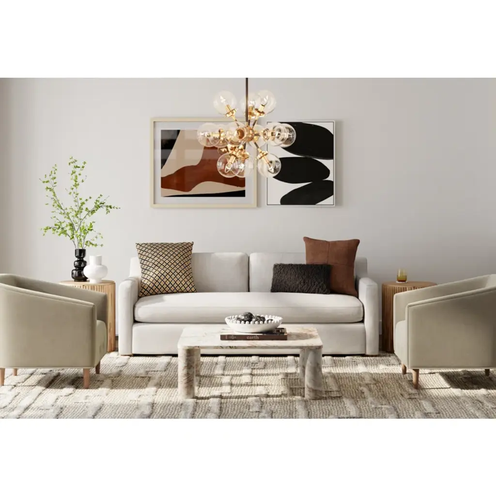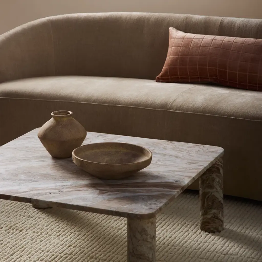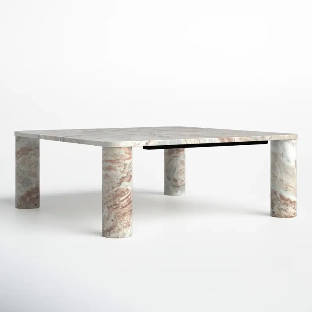Soft edges, bold shape. This square coffee table blends sculptural design with luxe materials — a grounded focal point that still feels refined. The cylindrical legs and layered marble look bring just enough drama to anchor a room without overwhelming it. A standout for living spaces that lean contemporary, collected, or a little of both.