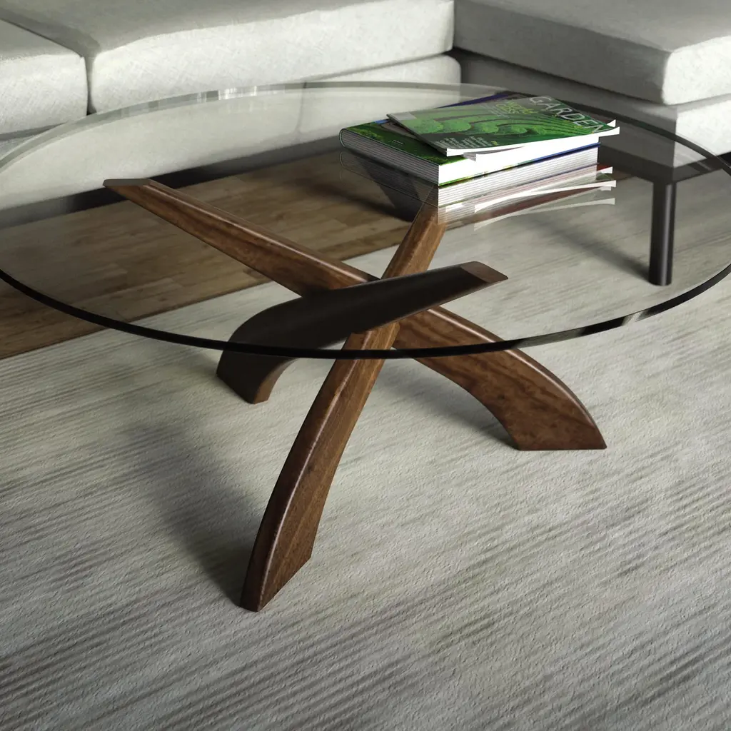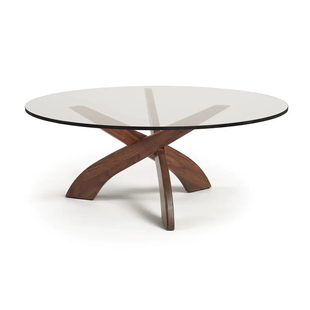 Step aside dining rooms and bedrooms. It's time for the living room to make a big statement. As a part of Copeland's Statement Collection, our Entwine Walnut Coffee Table features a round clear glass top resting atop a sculptural walnut base. The unique design of this made-to-order coffee table accentuates the natural characteristics of the walnut base to perfection. If you are a fan of artistic furniture design and quality materials than this coffee table is perfect for you.Base price represents table in natural walnut with glass topShown in natural walnut with 15 mm tempered glass topMatching furniture available in our Statements Furniture Collection