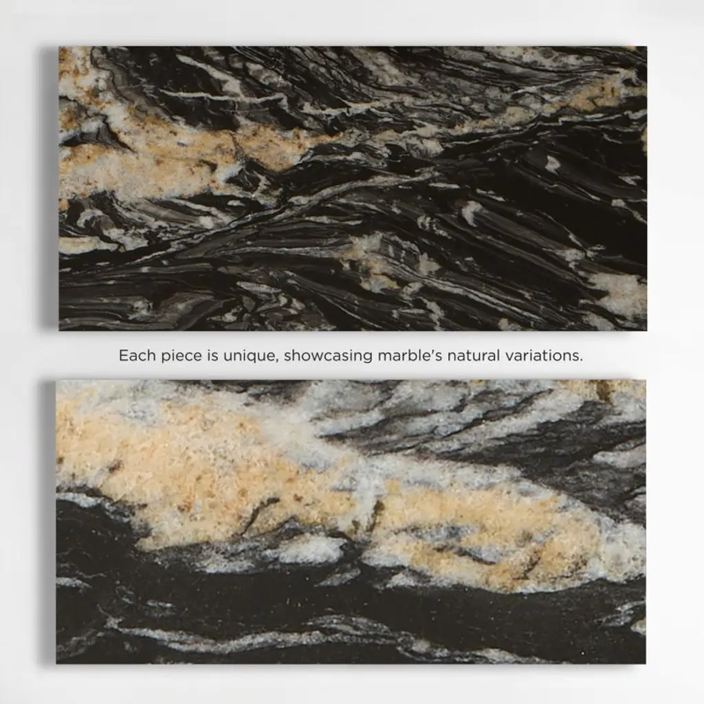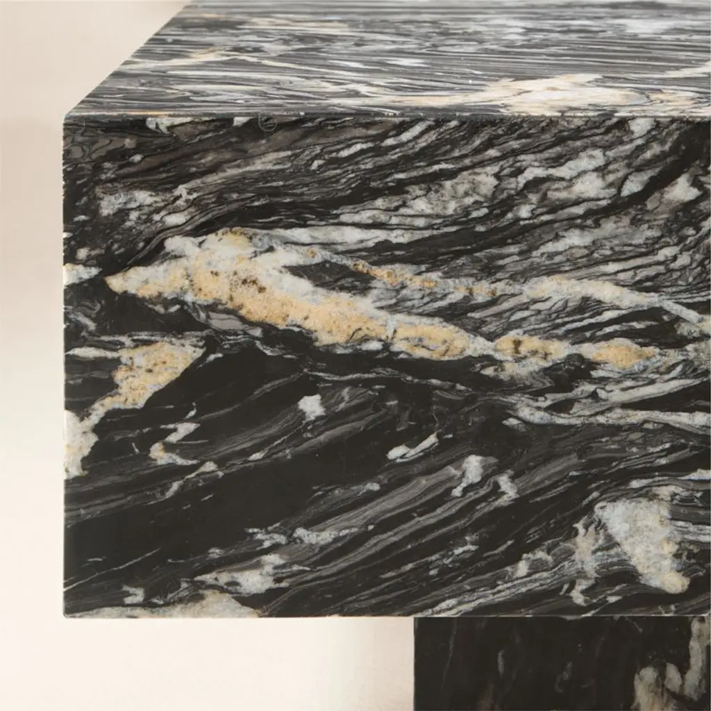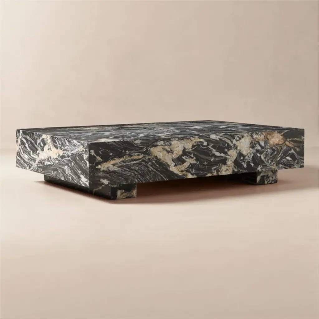 Inspired by ancient post-and-lintel construction, rectangular coffee table by VUUE has a bold, architectural form. Sleek black marble features prominent veining and varying tones; due to the natural beauty of the stone, each piece is unique. Scaled to complement large sectionals and spacious rooms, this low table makes a graphic statement in its simplicity. CB2 exclusive.