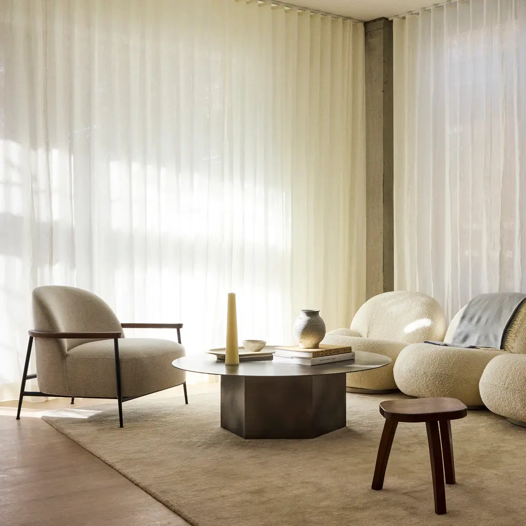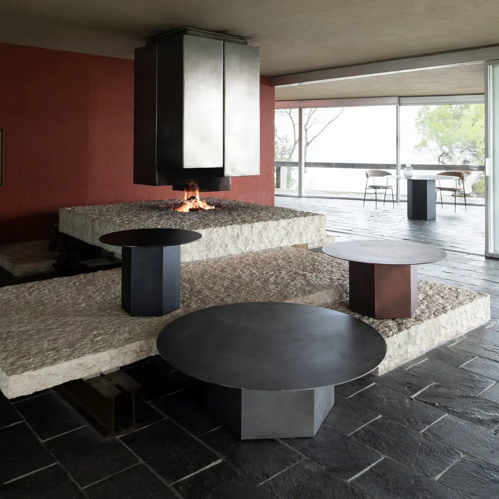 Suggested by Greek columns and Roman architecture, Gubi’s monolithic coffee table adds a steel version in the simple geometric form of a circle atop a hexagon. In a choice of monochromatic black, misty grey or an earthy red finish, Epic has a monumental character summoned by its very name. The varying heights and diameters of design duo GamFratesi’s 3-table series means each one can stand alone or be combined in dynamic clusters of varying height and color.