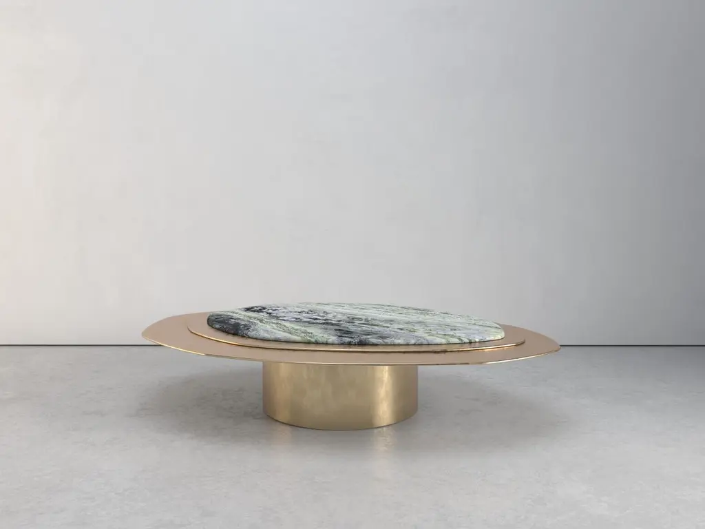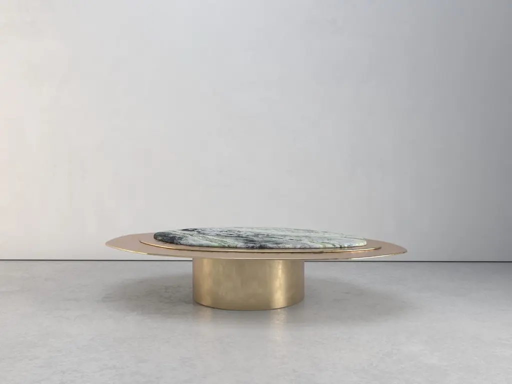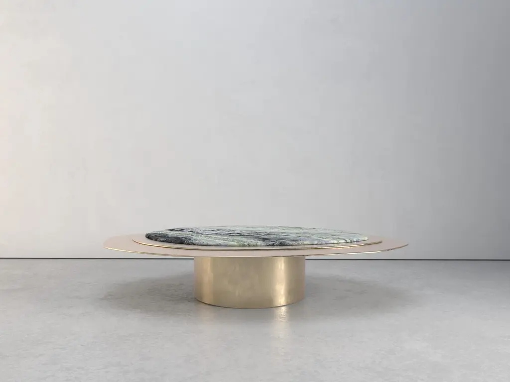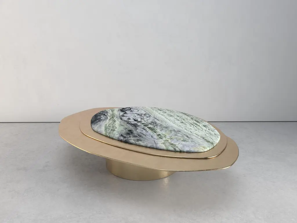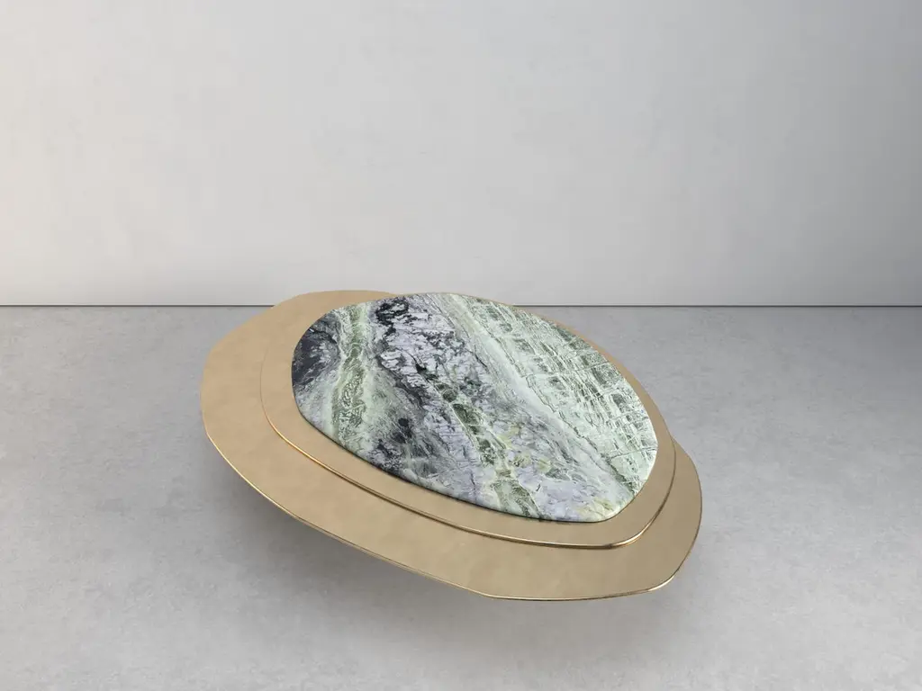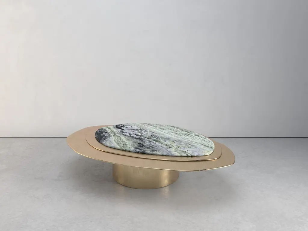Epicure IX Jade River Marble Limited Edition Coffee Table by Grzegorz MajkaLimited Edition Of 8 Pieces. Dimensions: D 125 x W 175 x H 35,5 cm.Materials: Jade River marble and solid brass.Luxury doesn’t always follow the common patterns. Luxury goes beyond and almost like one of the best gourmets joins varied experiences, ingredients, recipes into one.Exactly like our new piece of art called „”The Epicure’’, which could not present its beauty by itself. Only with the help of the other elements reveals the one complete part, one complete ’’island’’.Following this idea, we have selected the unique material such as Jade River marble.Satin finish highlights the irregular shapes, veins and the pits of the stone element designed by the Mother Nature.The solid brass elements in “Satin” finish highly effects the sophisticated and tasty look of the whole part.Grzegorz Majka is a self-taught Polish artist who explores the concepts of modularity, sculptural form, and artisanal processes in the design of furniture and lighting. His work seamlessly blends craft and contemporary design, incorporating high-quality noble materials like natural stone, wood, metals, and hand-blown glass. Guided by a deep respect for the inherent character of materials, Grzegorz highlights natural irregularities, textures, and patterns - veins in stone, the living patina of untreated metals, the organic feel of brushed surfaces. These elements are not hidden but embraced, inviting collectors on a sensory journey through touch and time.His studio practice focuses on handcrafted limited-edition furniture that is not only functional, but also living, authentic, collectible art.