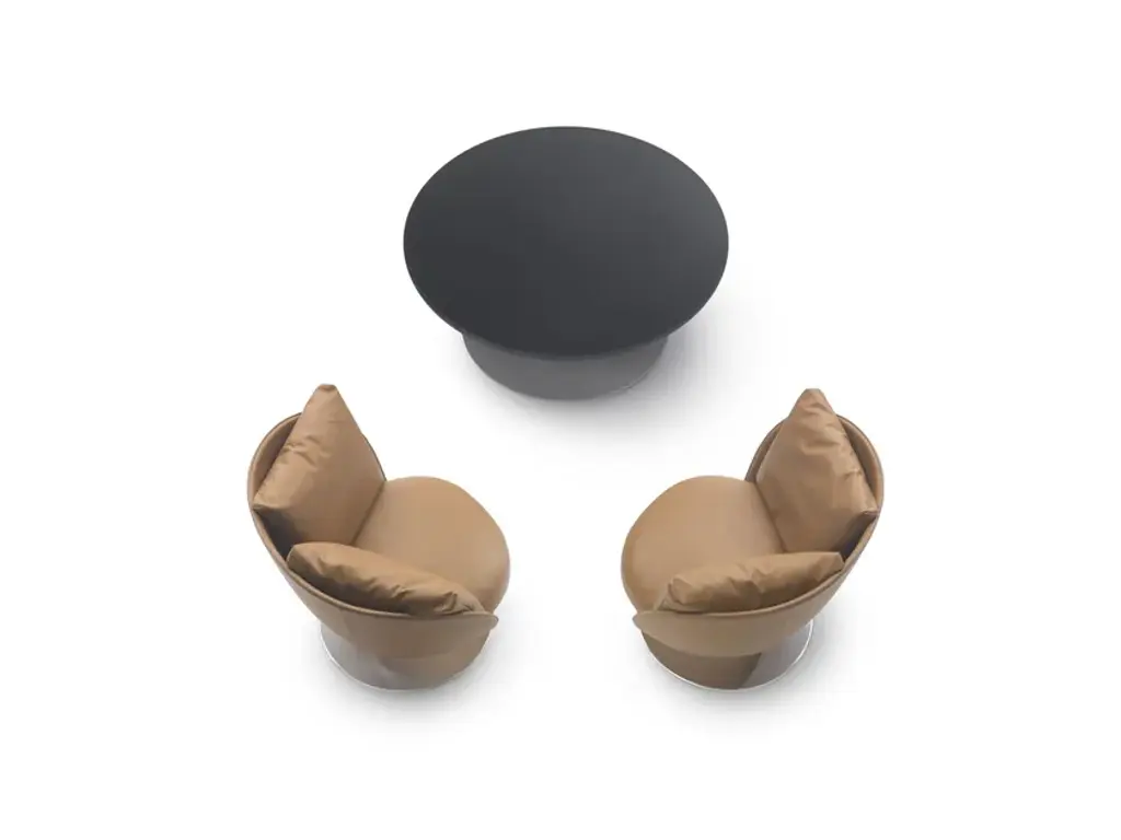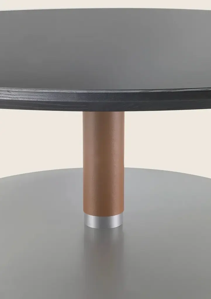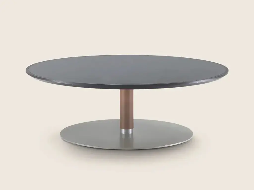 ERI is a round coffee table.In perfect harmony with the matching poufs and armchair, this coffee table features a metal base available in a variety of elegant finishes. The tabletop can be made of solid wood or in a veneered version with a lacquered glass insert.FeaturesStructure: in satin metal, chrome, burnished, black chrome, glossy anthracite, matte titanium 710. The central column is upholstered in leather.Top: in solid Canaletto walnut wood with raw, natural, extra-stained finishes or in ash wood with natural, walnut-stained, teak-stained, wenge-stained, brown-stained, ebony-stained finishes, or in oak wood with a raw effect finish. Alternatively, in veneered wood with a lacquered glass insert, available exclusively in the following combinations: Glossy Silk glass 2010 for natural ash and raw oak finishes; Glossy Cocoa glass 2025 for raw Canaletto walnut, natural Canaletto walnut, walnut-stained ash, teak-stained ash finishes; Glossy Coffee glass 2030 for extra-stained Canaletto walnut and wenge-stained ash finishes; Glossy Black glass 2040 for brown-stained ash and ebony-stained ash finishes.Base: in metal in various finishes.Eri is a collection of products that includes armchairs, poufs, and coffee tables.The elegantly raised collar of a jacket is the motif that inspired the subtle design of this family.Characterized by a soft and enveloping aesthetic, each variant of Eri is carefully designed to promote a satisfying sense of relaxation and comes in a wide selection of materials and fabric coverings, creating a play of interesting combinations.