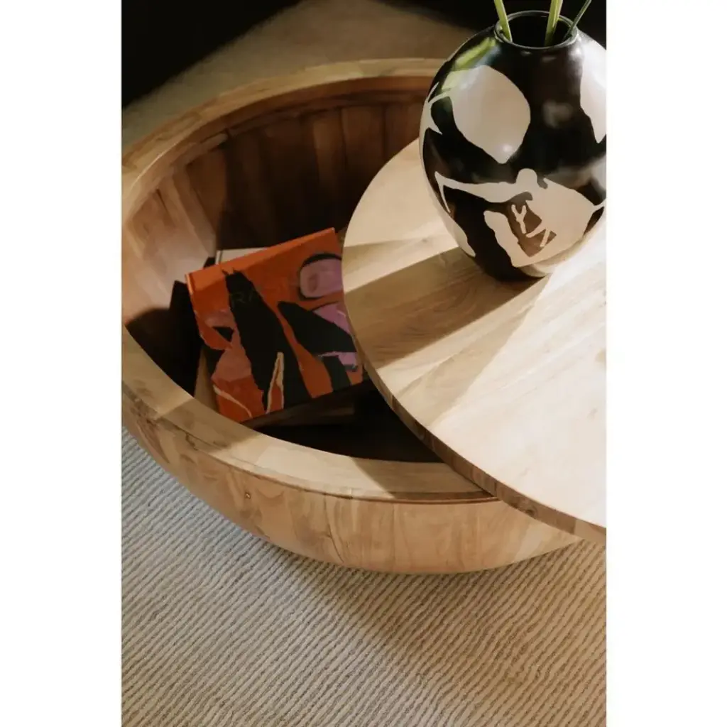 Walk to the beat of your own drum with the modern rustic Eske storage coffee table. Crafted from beautiful solid Acacia wood with a swivel top that reveals discreet storage space, the Eske brings an element of nature and function to any living room.